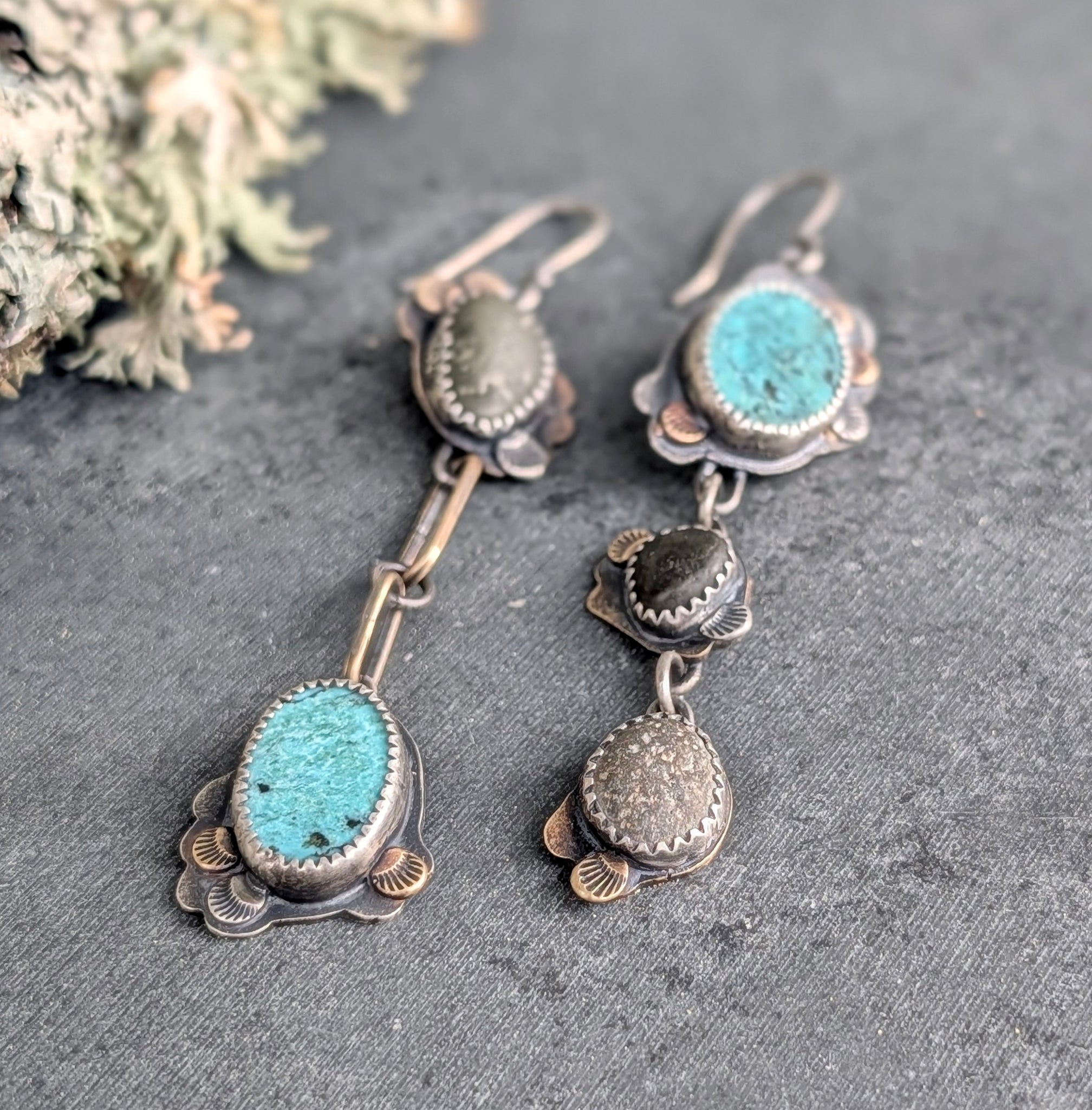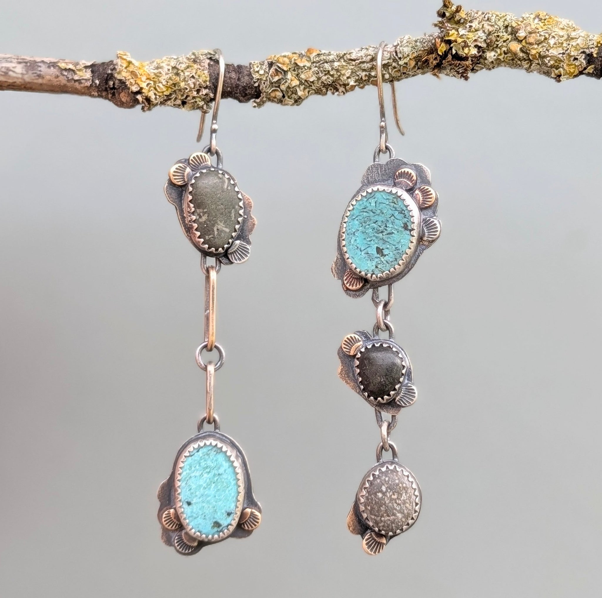 These earrings feature a collection of unique stones - two vibrant blue turquoise paired with three smooth matte beach stones tumbled smooth by many years of crashing waves.