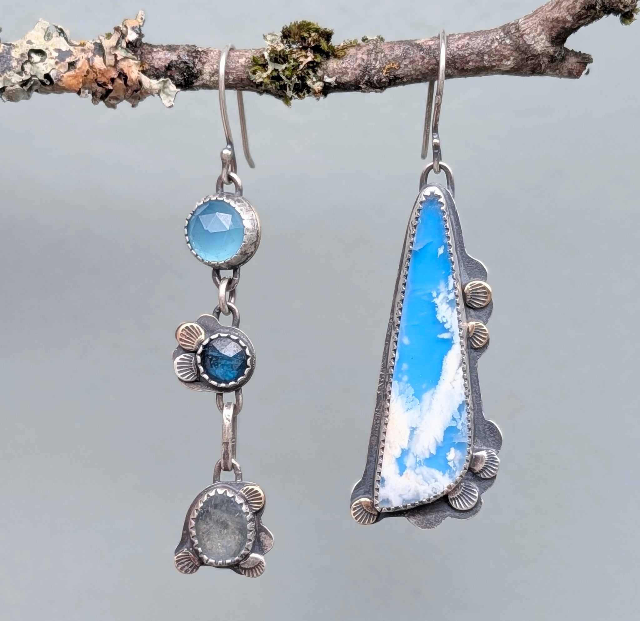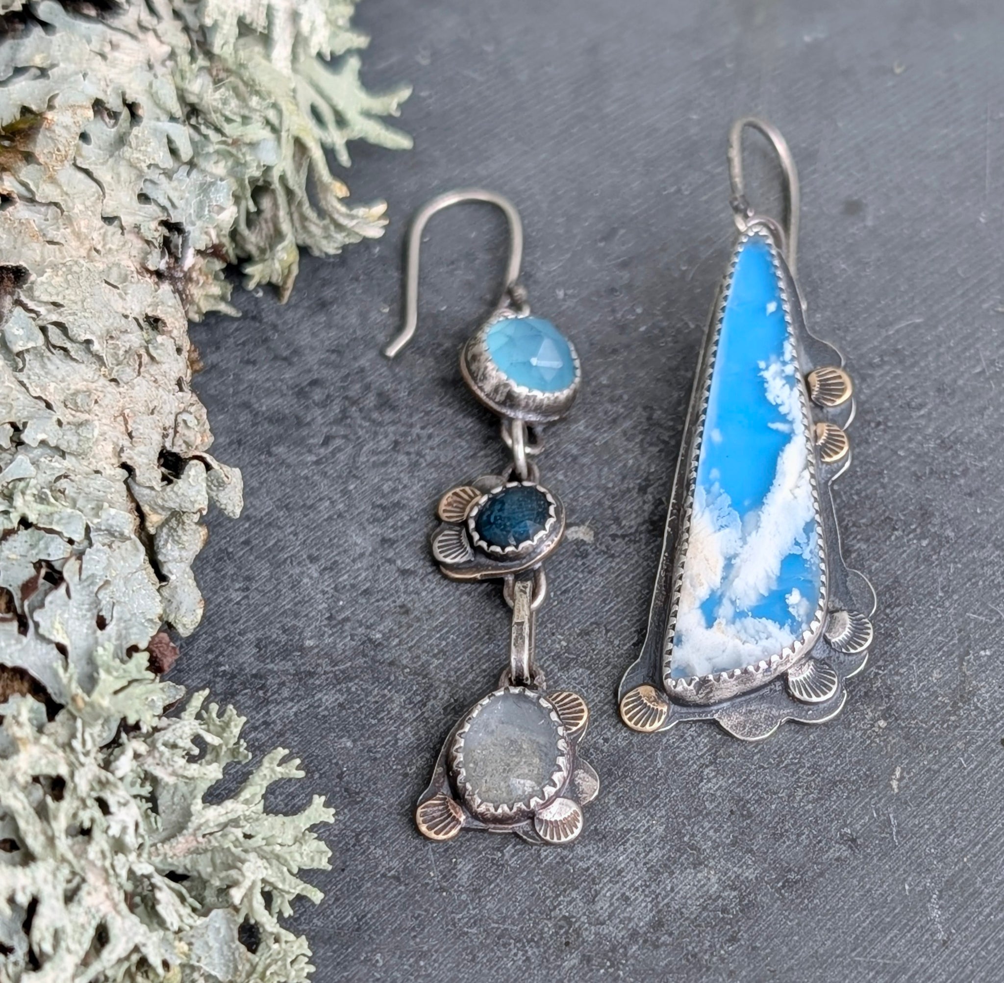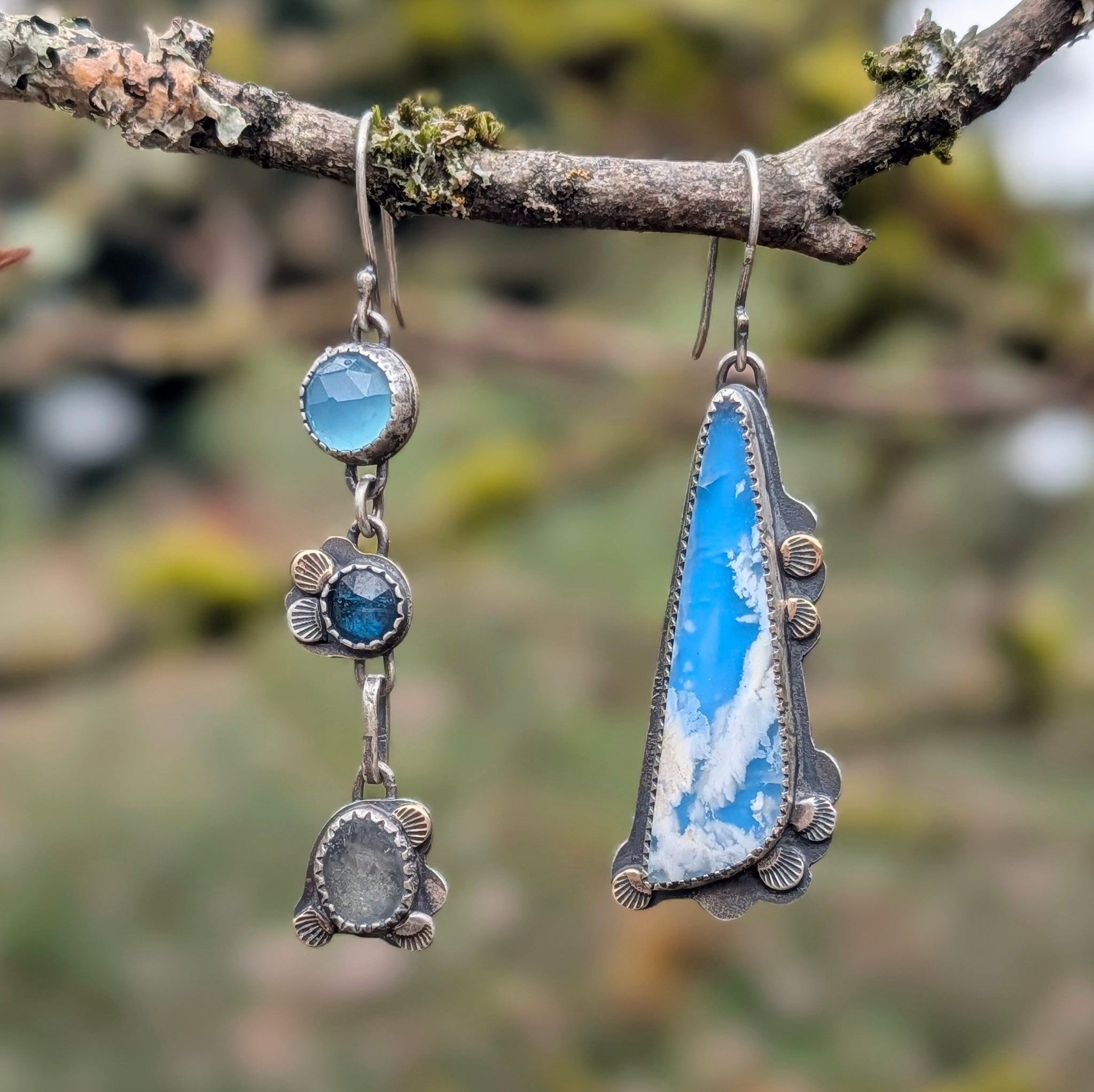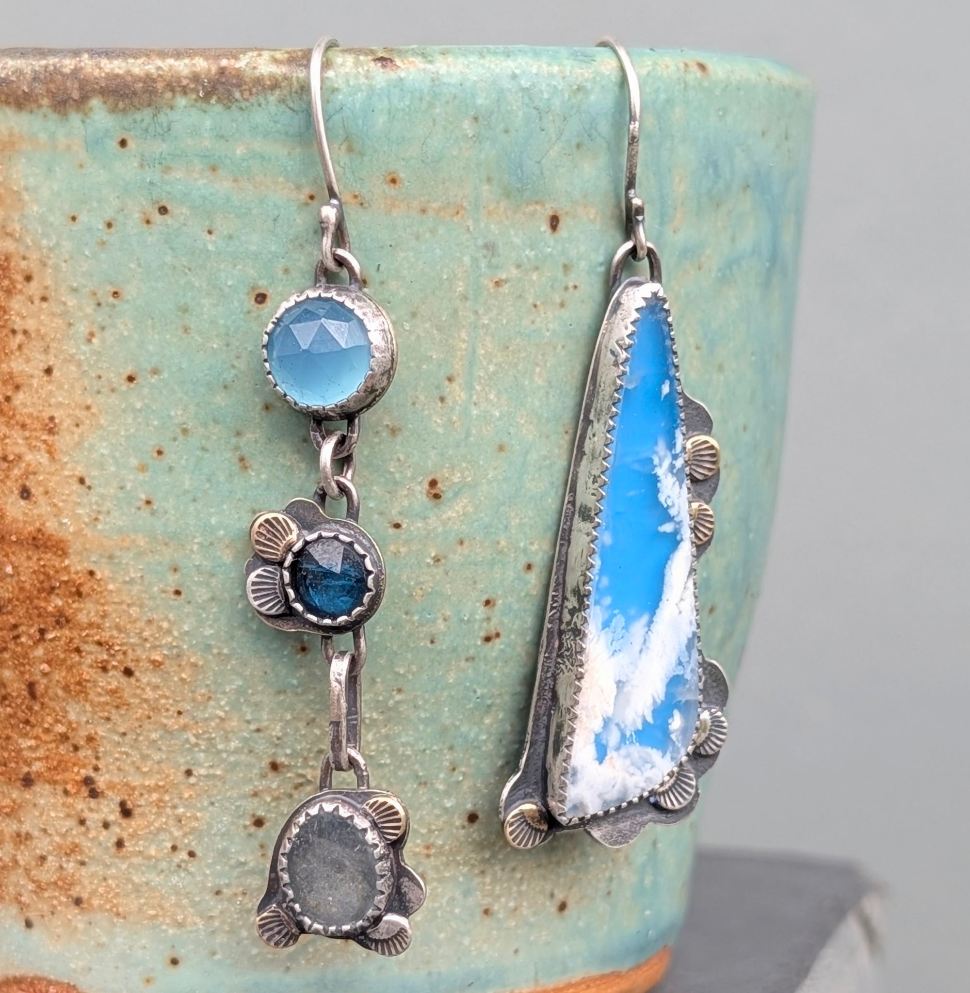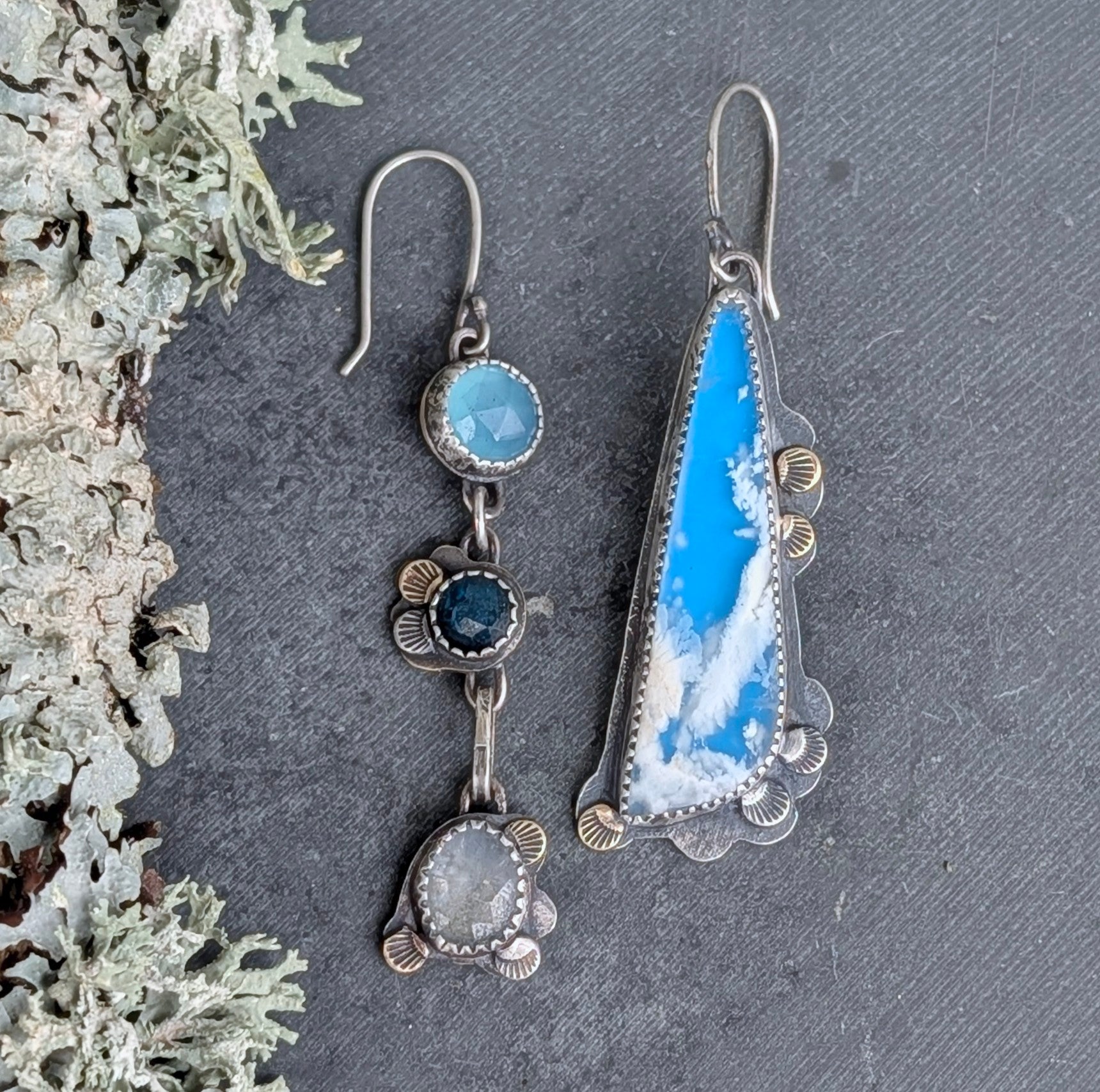 These earrings feature a selection of four stunning gemstones that invoke blue skies - a striking plume agate doublet (backed with resin), a bright round of chaldoncy, a tiny deep blue rosecut kyanite and finally a moss aquamarine. All stones have been set in fine silver bezels with a hammered texture for a rustic look and feel.