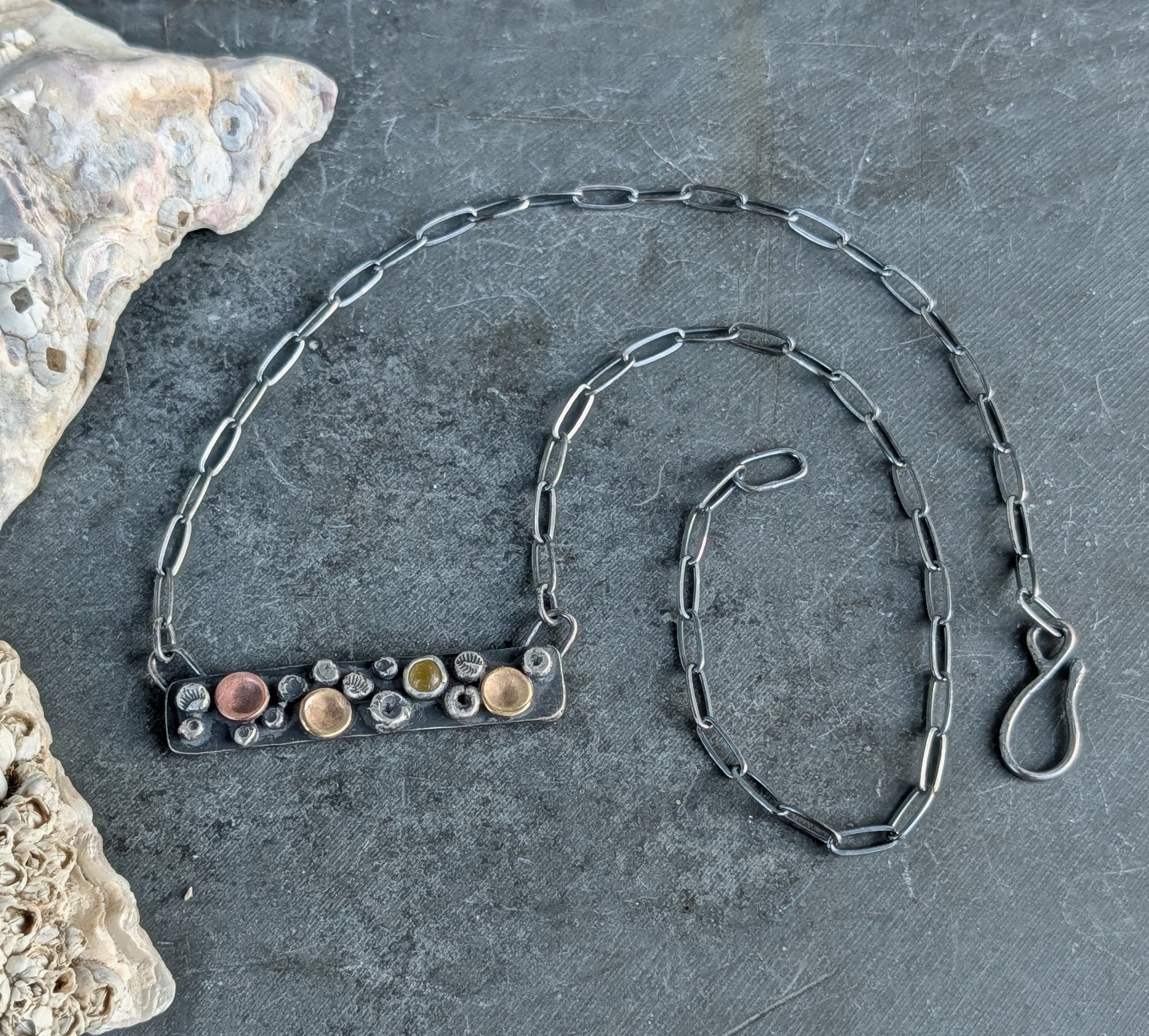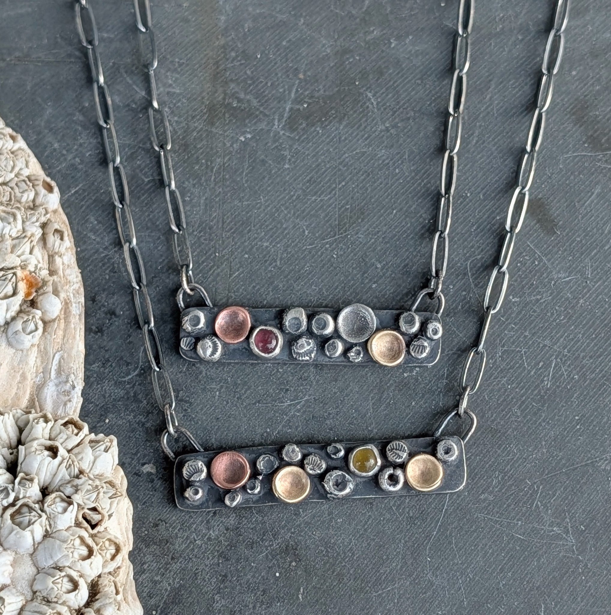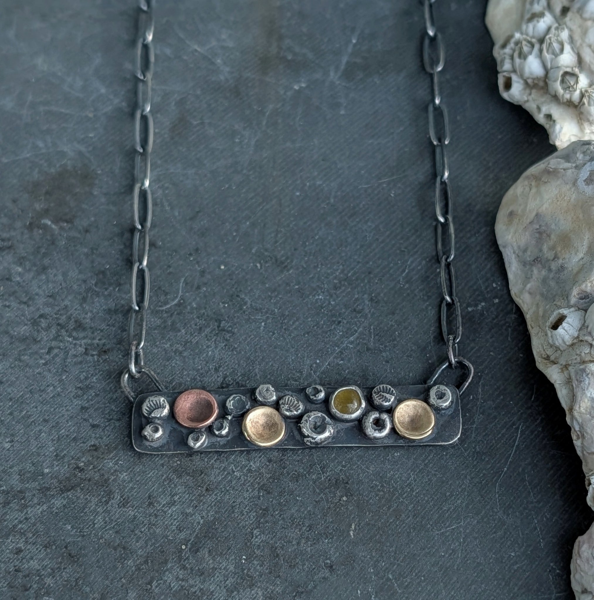Inspired by the rocky coasts of the PNW, this necklace features sterling, fine silver, copper, and brass barnacles fused together, hammered, shaped, and soldered to a sterling base. A small round of yellow watermelon tourmaline pops amoung the organic metal shapes.