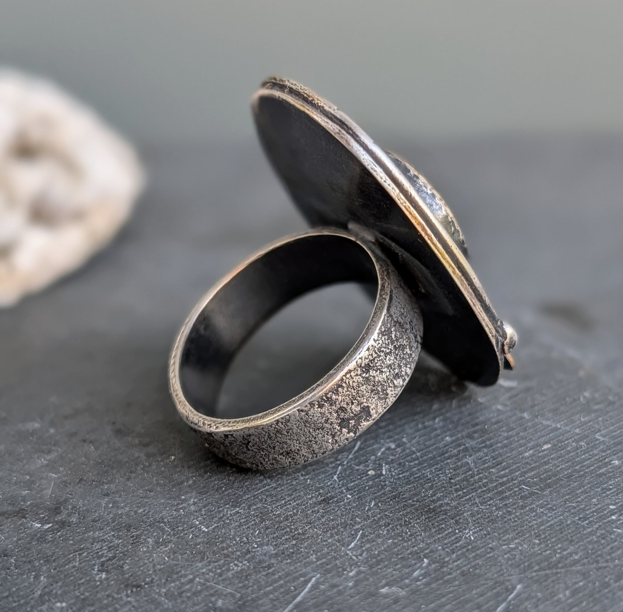 Size: this ring measures a size 8.75 on a ring mandrel on a wide band. The band is slightly tapered for comfort