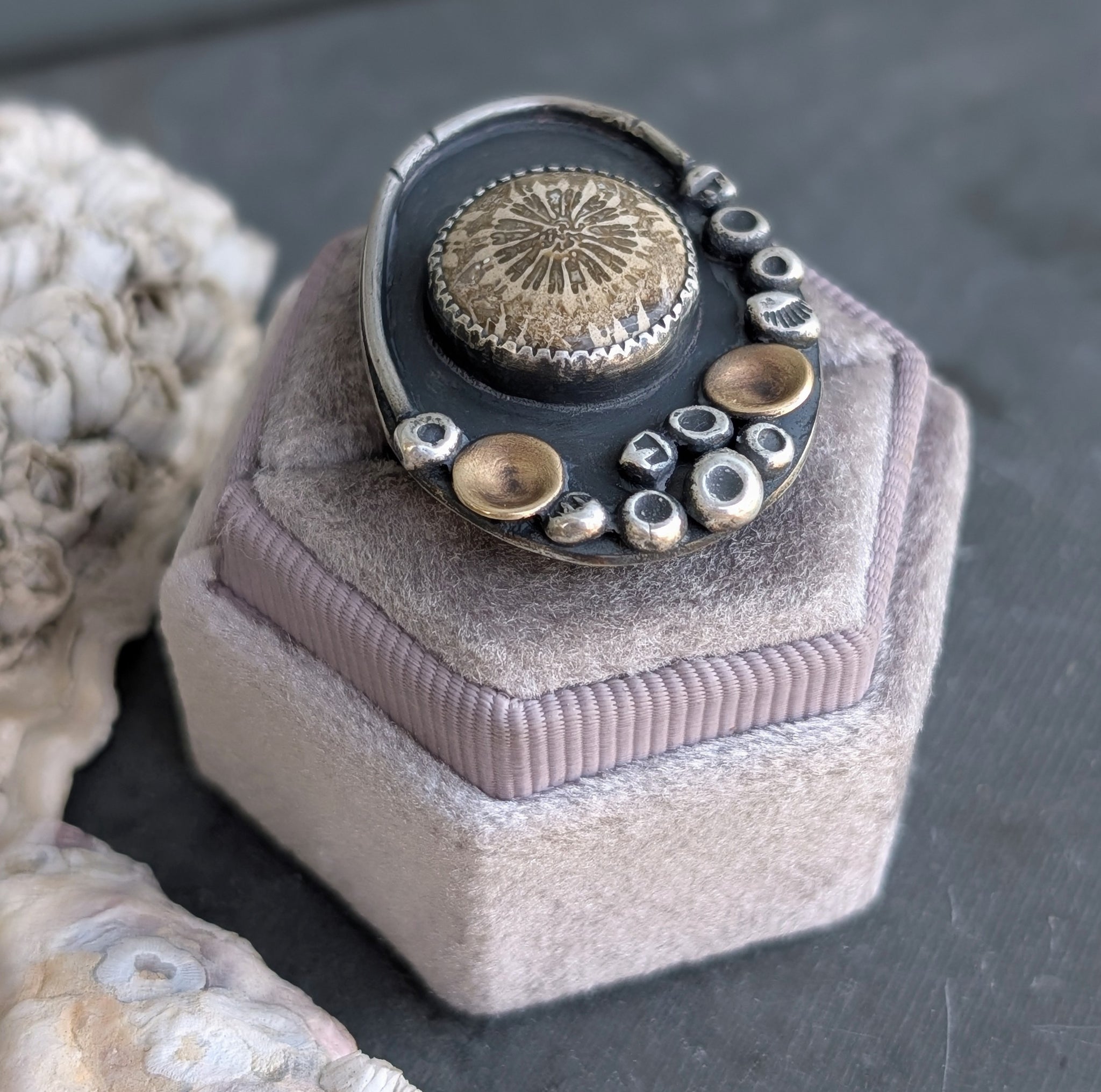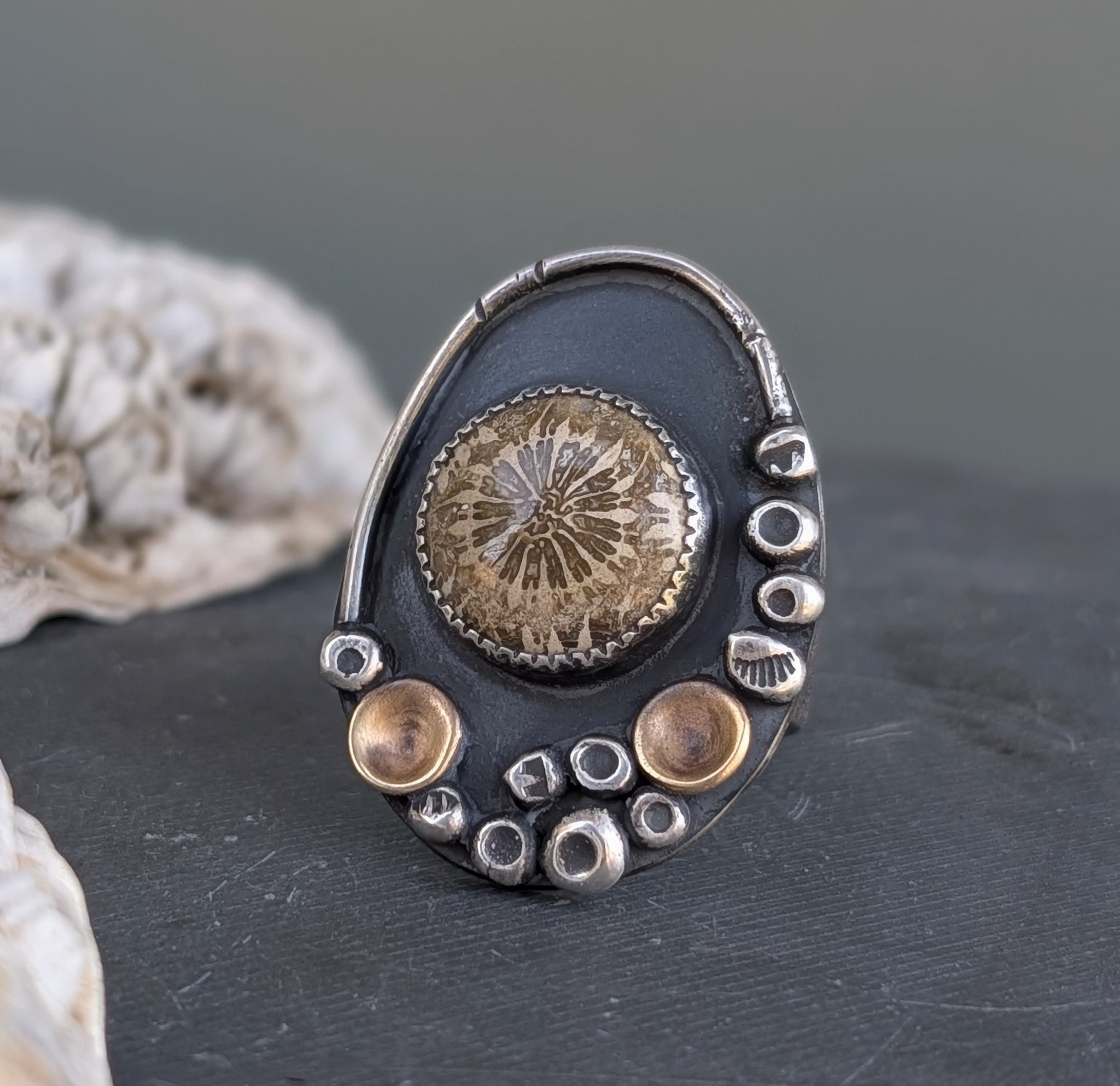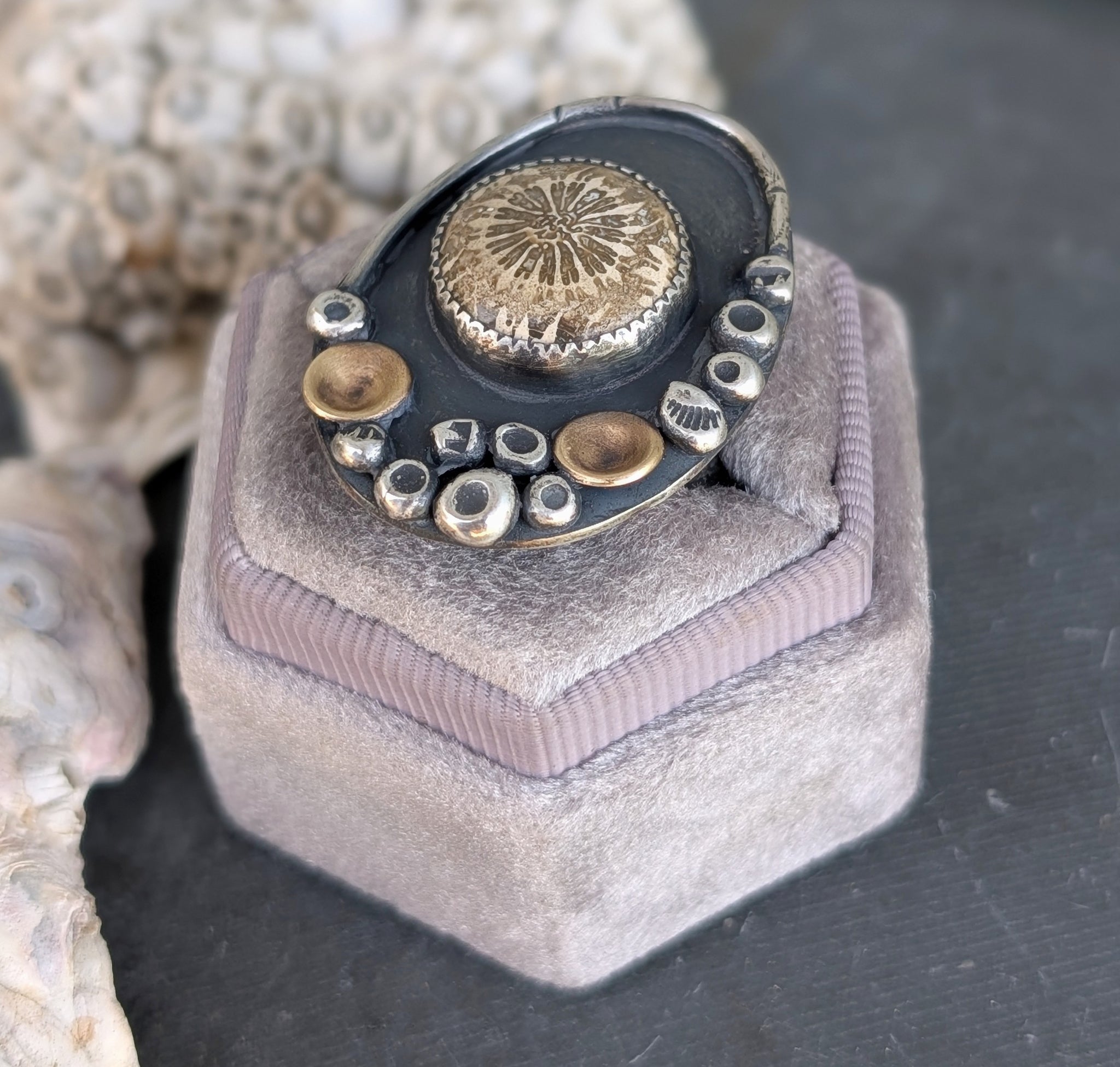 This mixed metal barnacle ring was fabricated by hand and features a distinctive round of fossilized coral and a unique fused silver dust ring band.