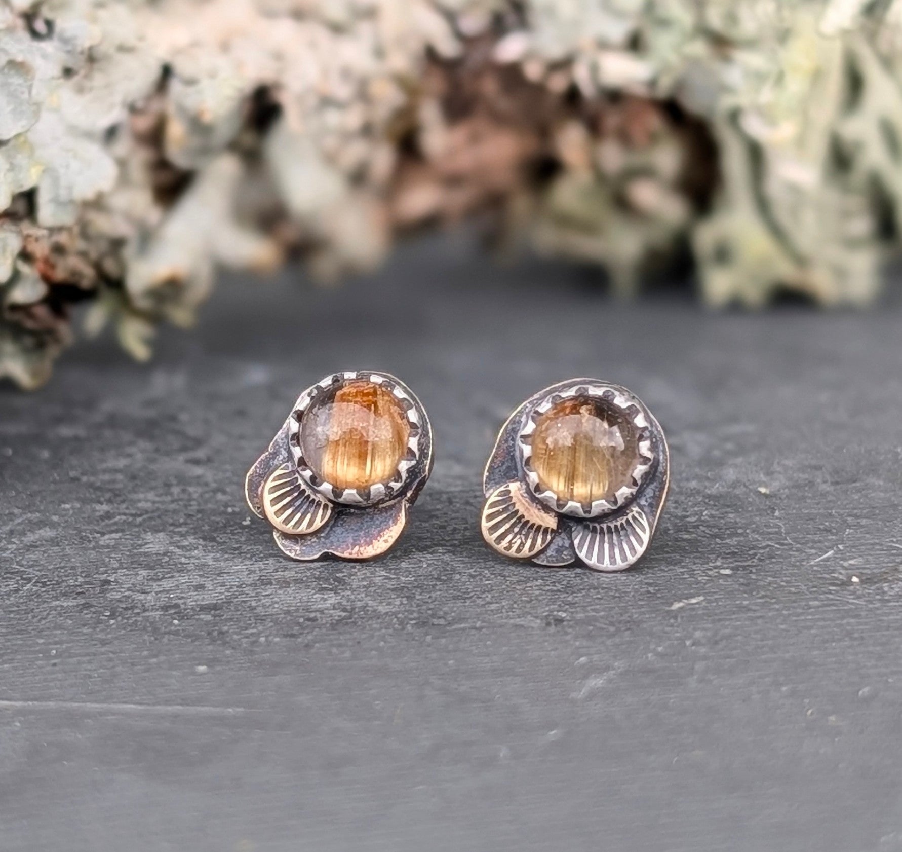 This whimsical asymmetrical pair features a duo of golden rutilated quartz stones that capture the light, framed with mixed metal lace.