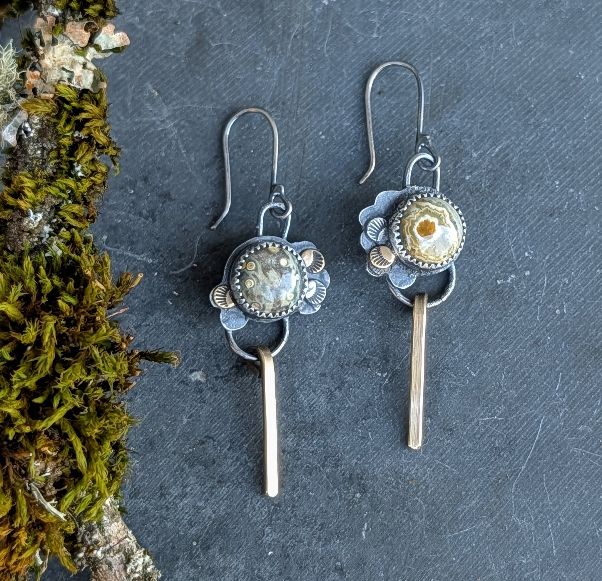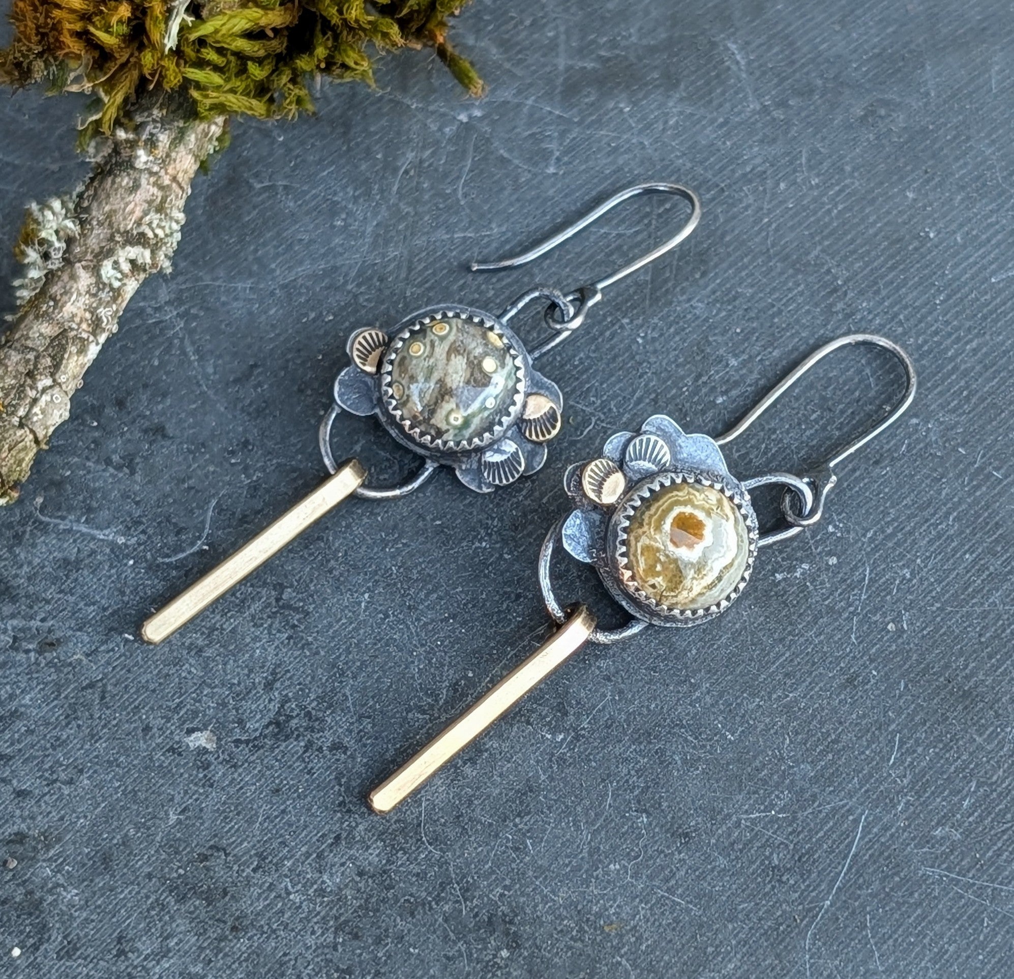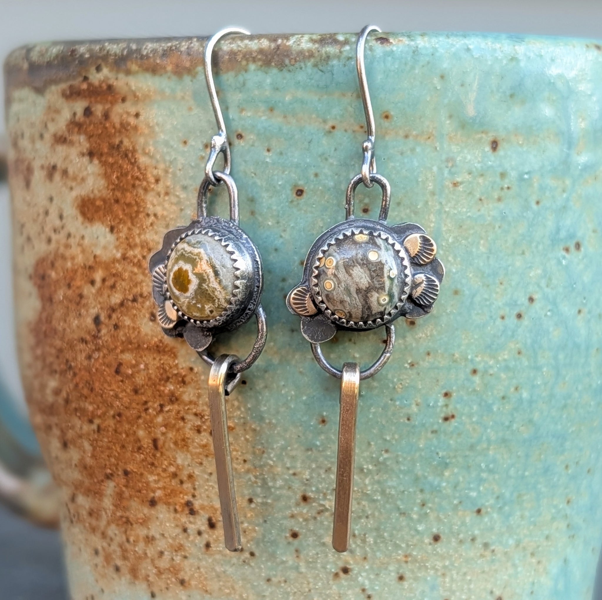 Featuring earthy asymmetrical jasper stones surrounded by mixed metal lace. Full of rustic texture and ending with a single brass fringe.