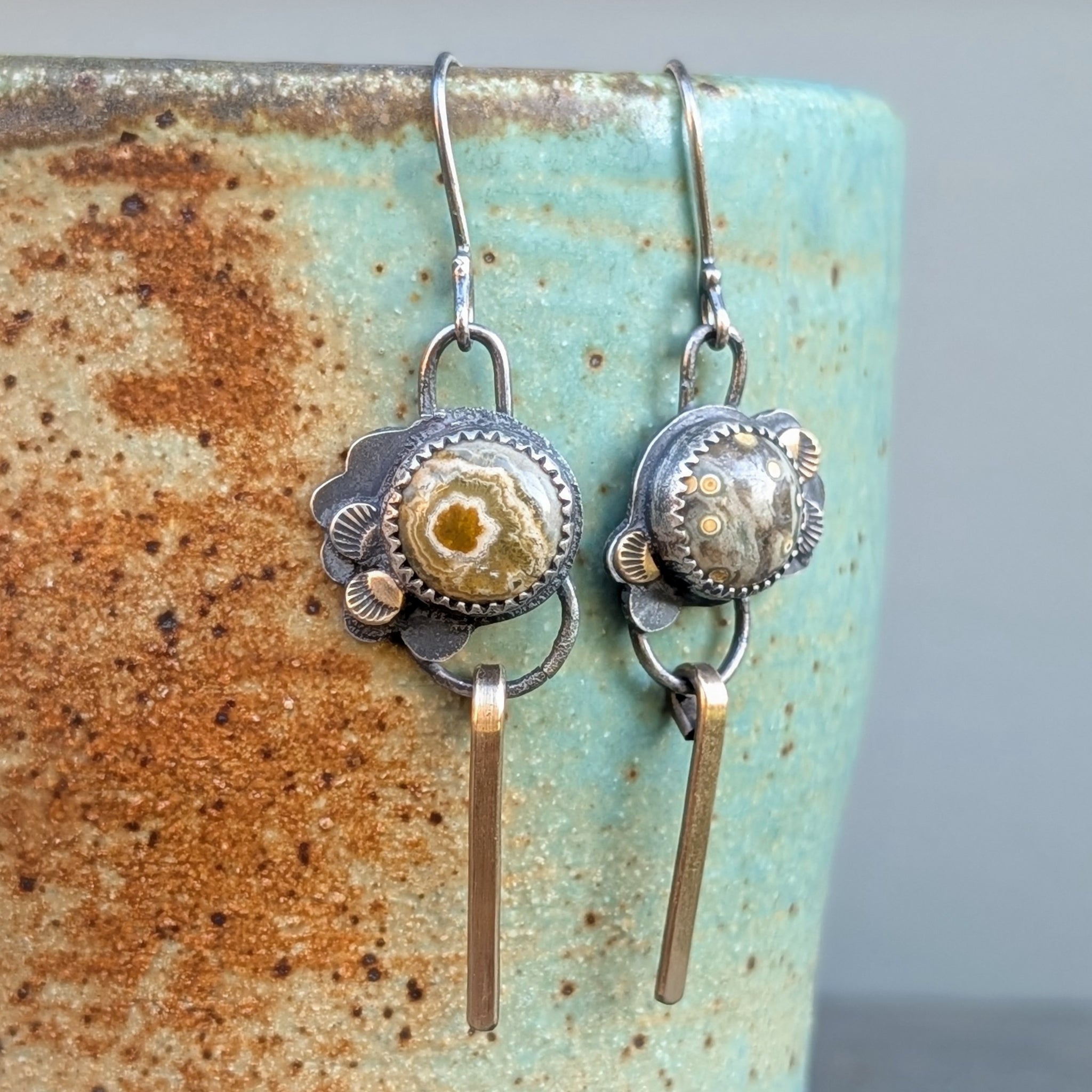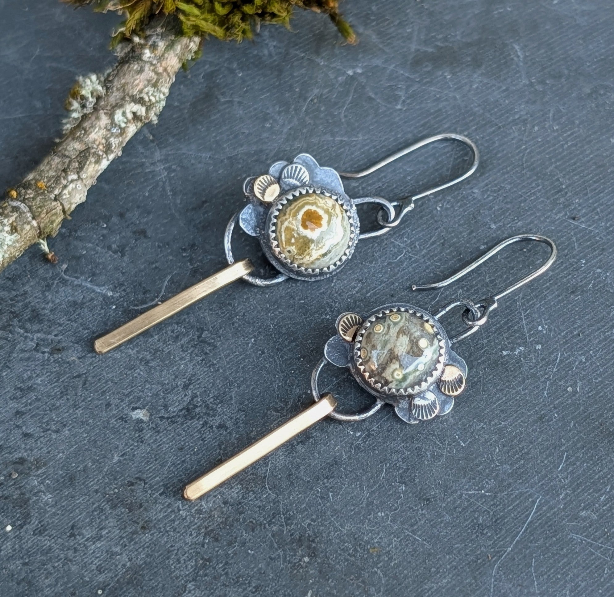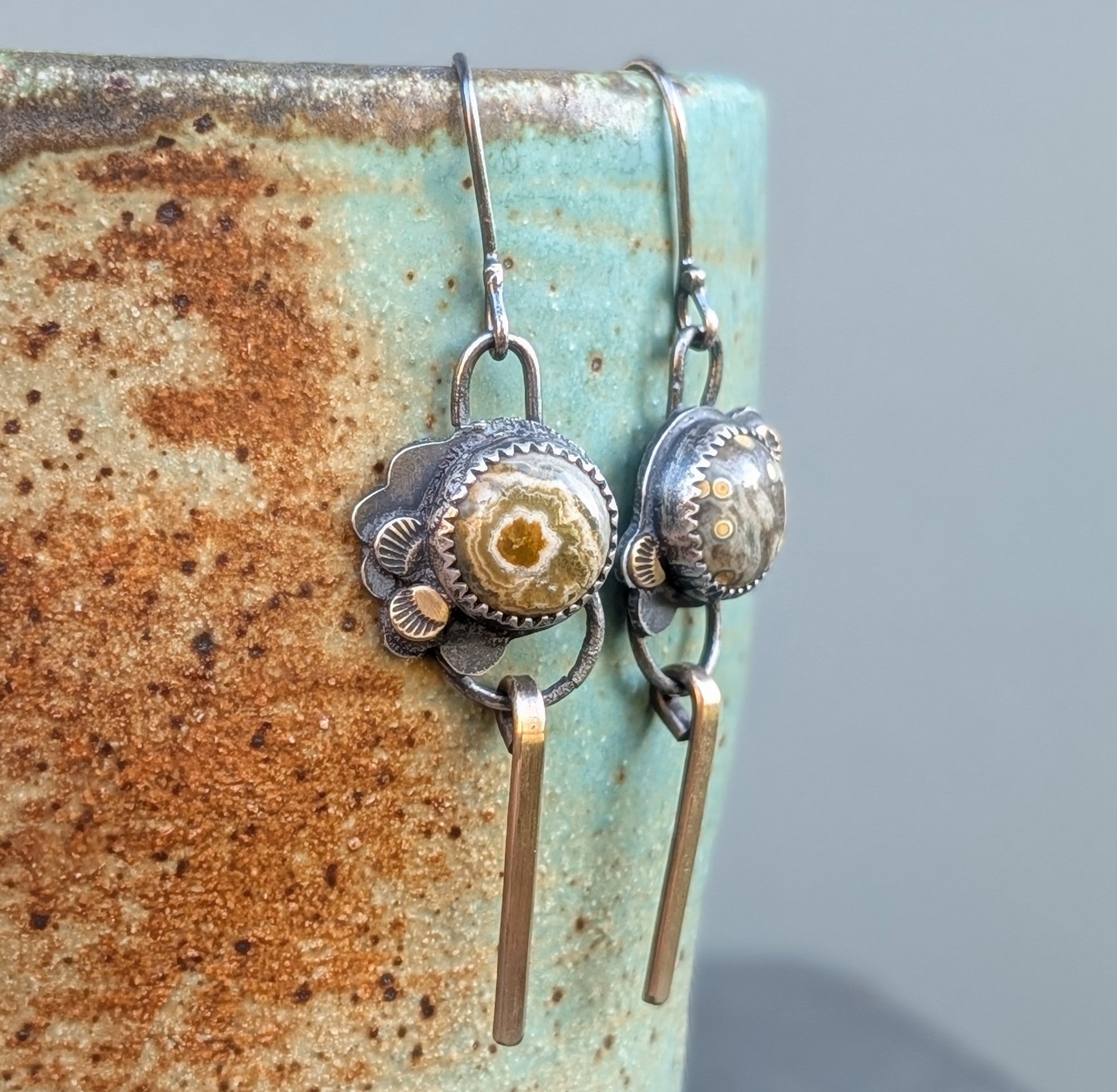Featuring earthy asymmetrical jasper stones surrounded by mixed metal lace. Full of rustic texture and ending with a single brass fringe.