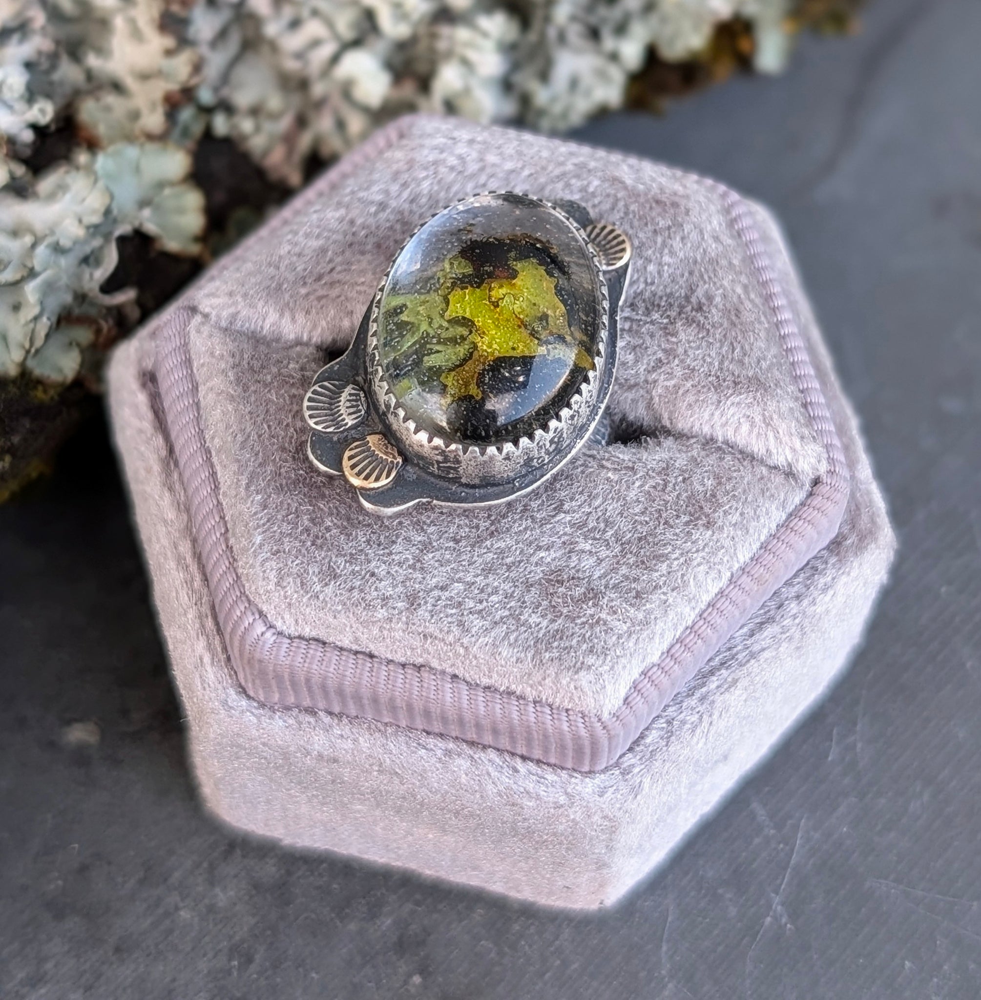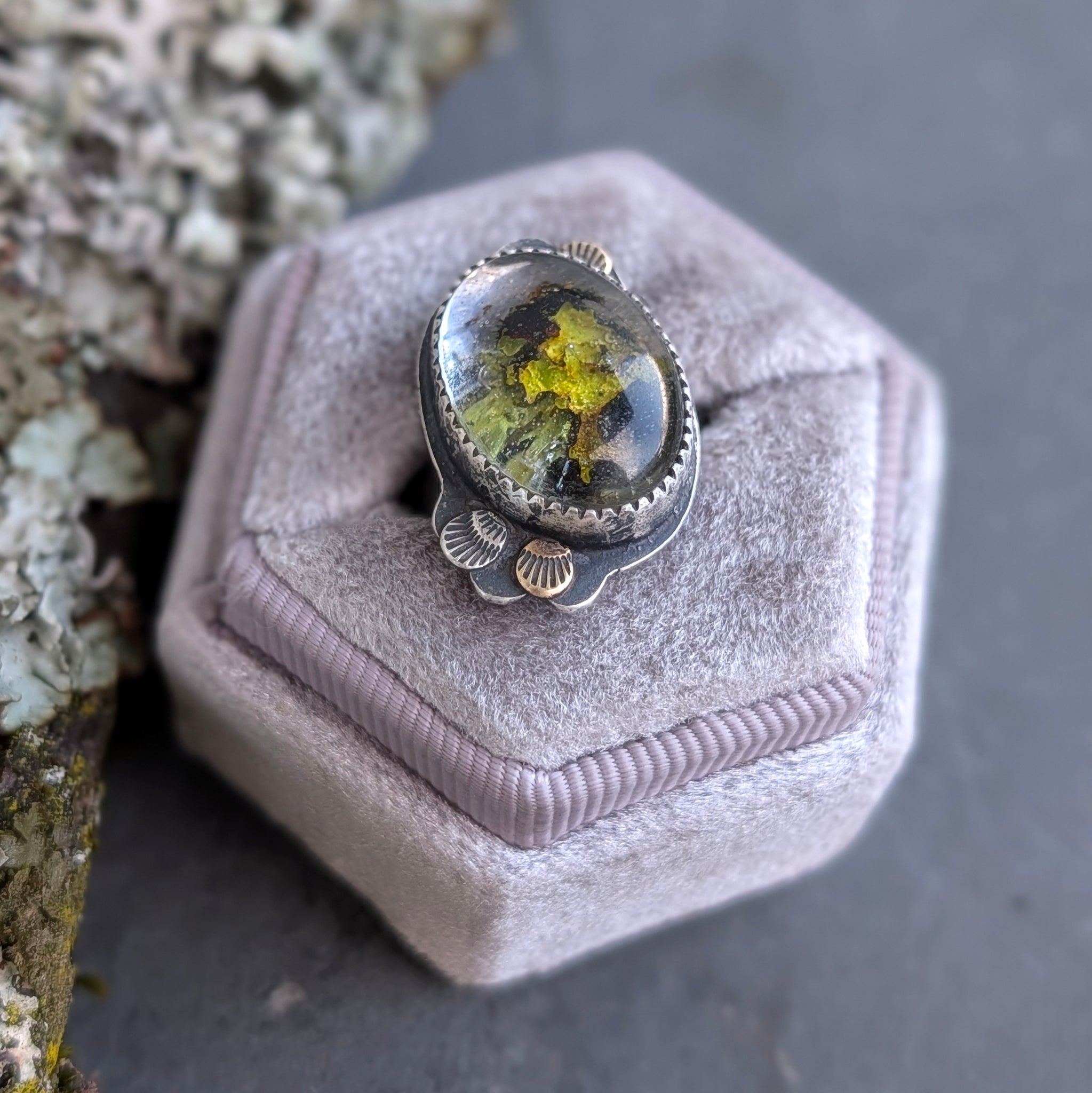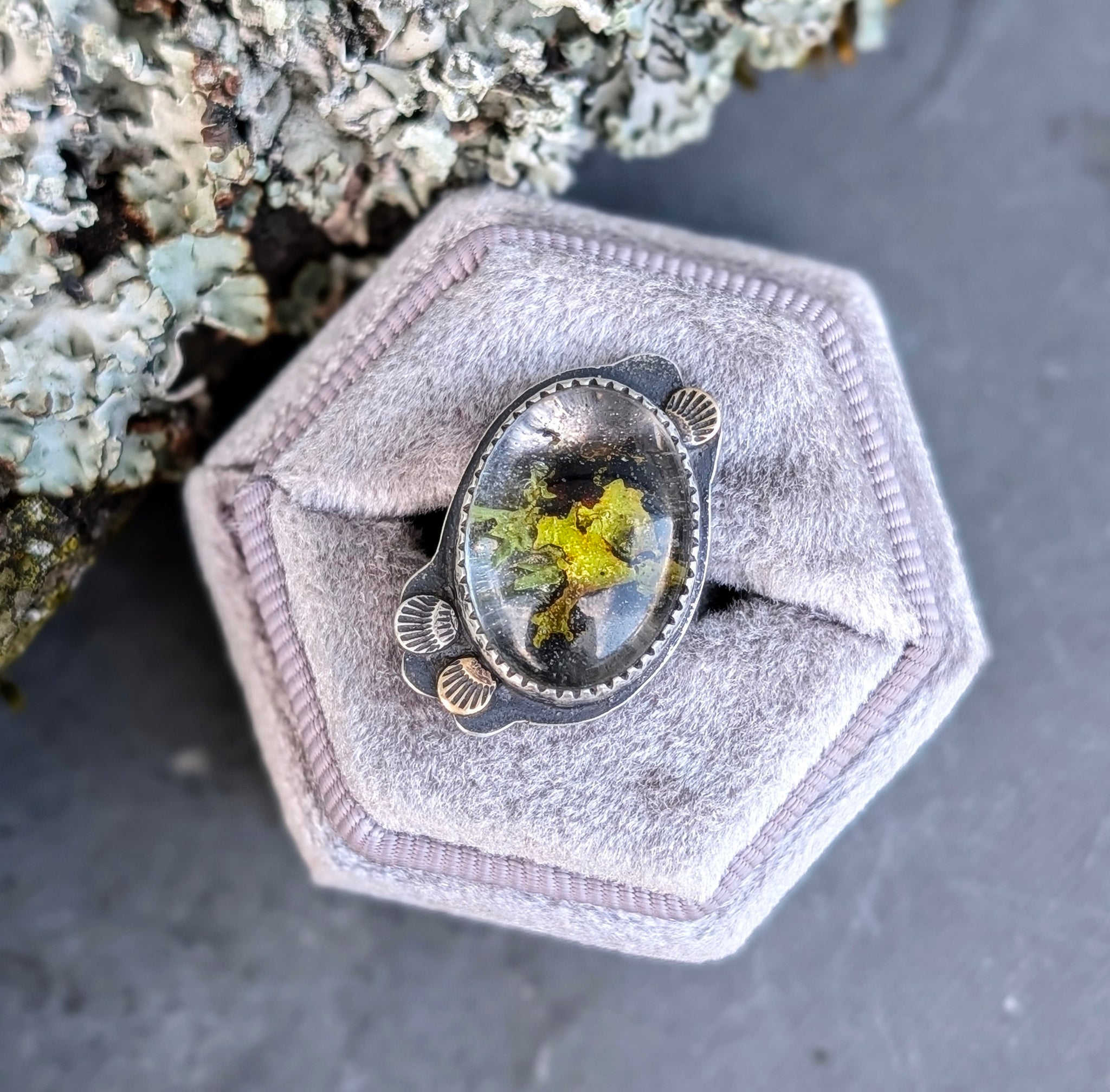 This resin "stone" was created by suspending lichens in eco-friendly resin.  The "stone" has been wrapped in a textured sterling bezel and paired with hand-fabricated mixed metal lace meant to honor the beautiful forms of bracket mushrooms, such as medicinal turkey tail. A sterling silver band with a mushroom print completes this statement ring.