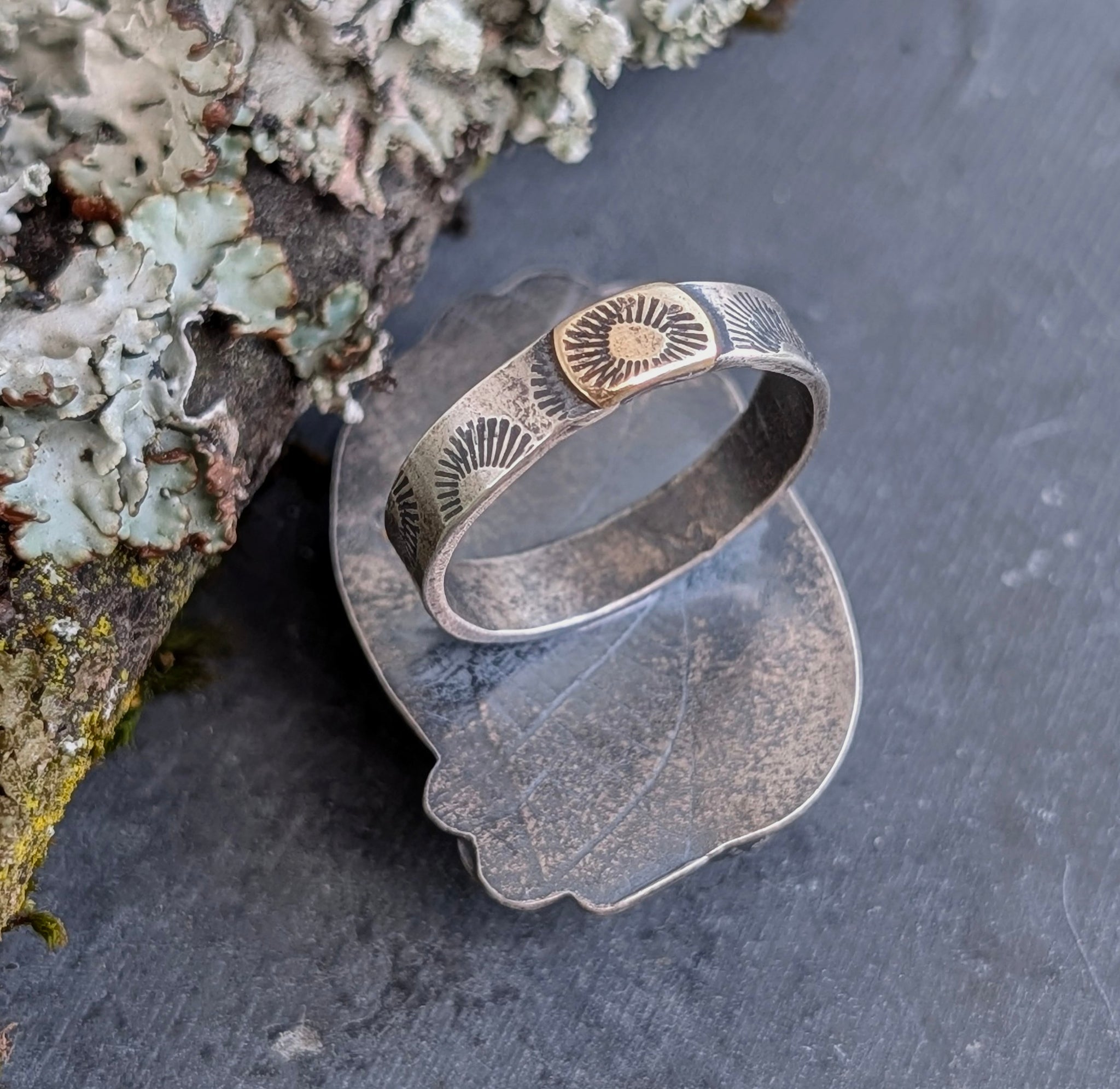 This resin "stone" was created by suspending lichens and bark in eco-friendly resin.  The "stone" has been wrapped in a textured sterling bezel and paired with hand-fabricated mixed metal lace meant to honor the beautiful forms of bracket mushrooms, such as medicinal turkey tail. A sterling silver band with a mushroom print and a brass accent completes this statement ring.