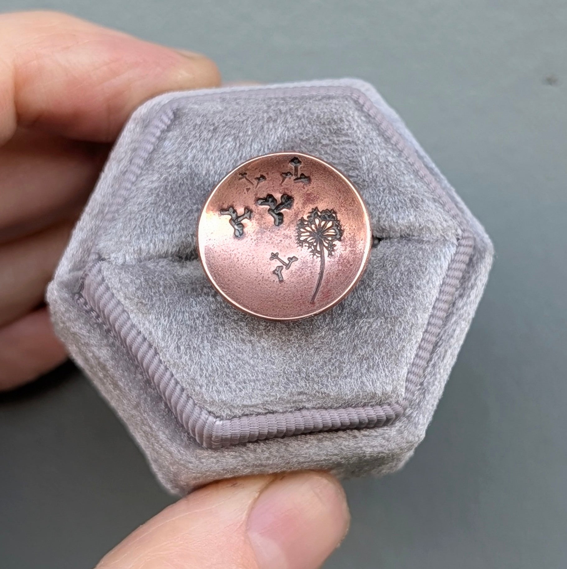 This Wish Ring features a hand-hammmered design on a concave copper disc and soldered to a beaded sterling silver band in your requested ring size.