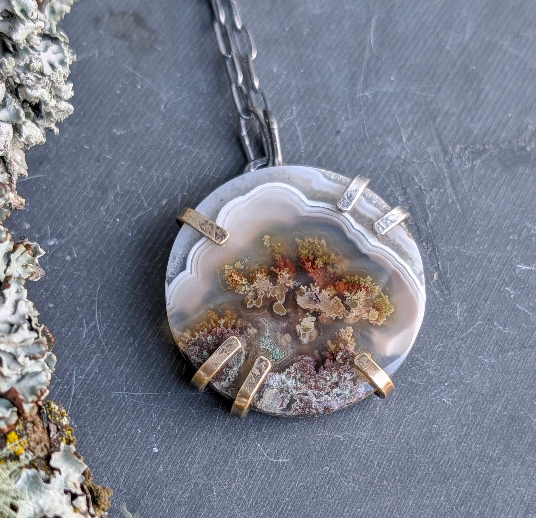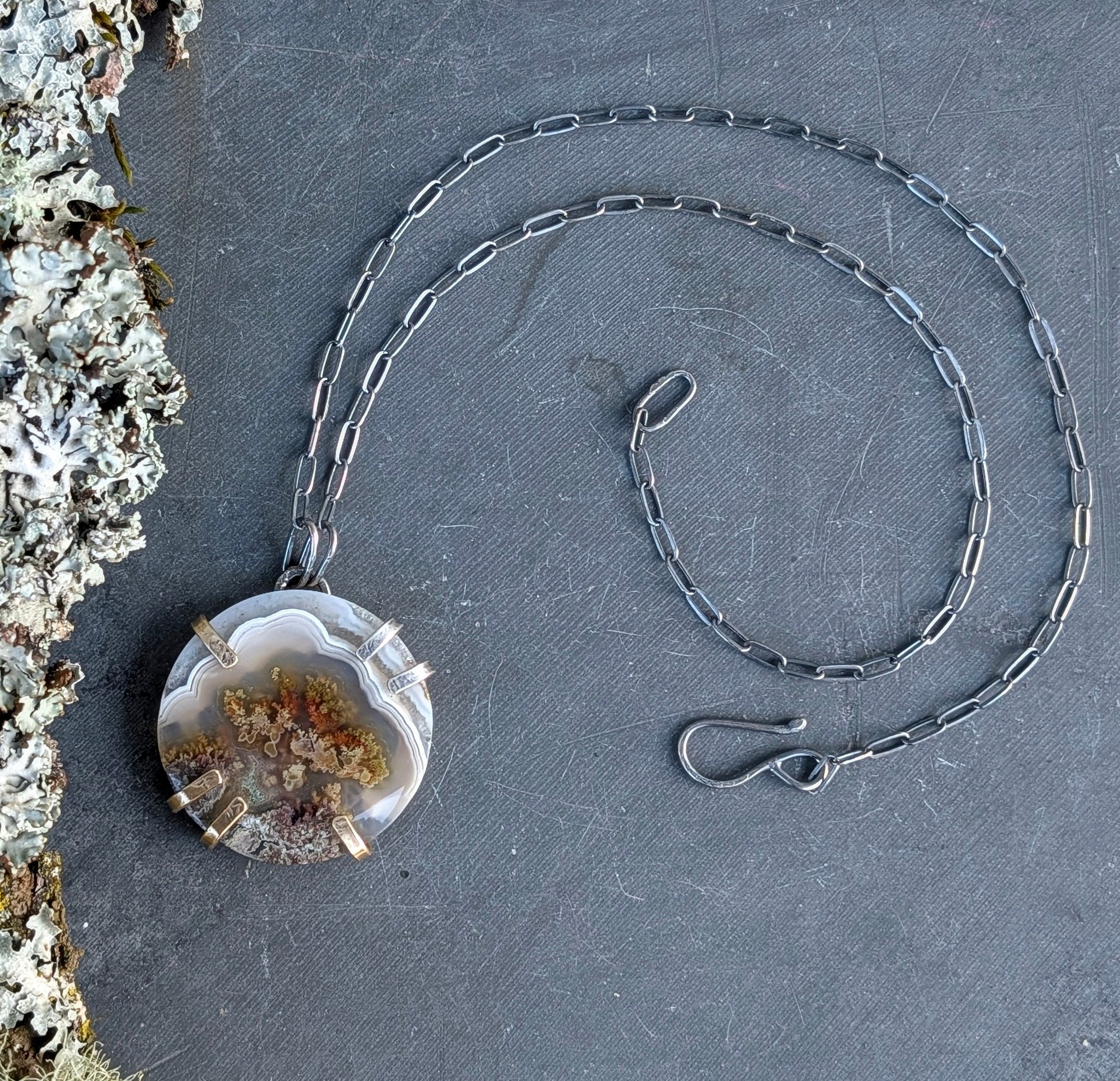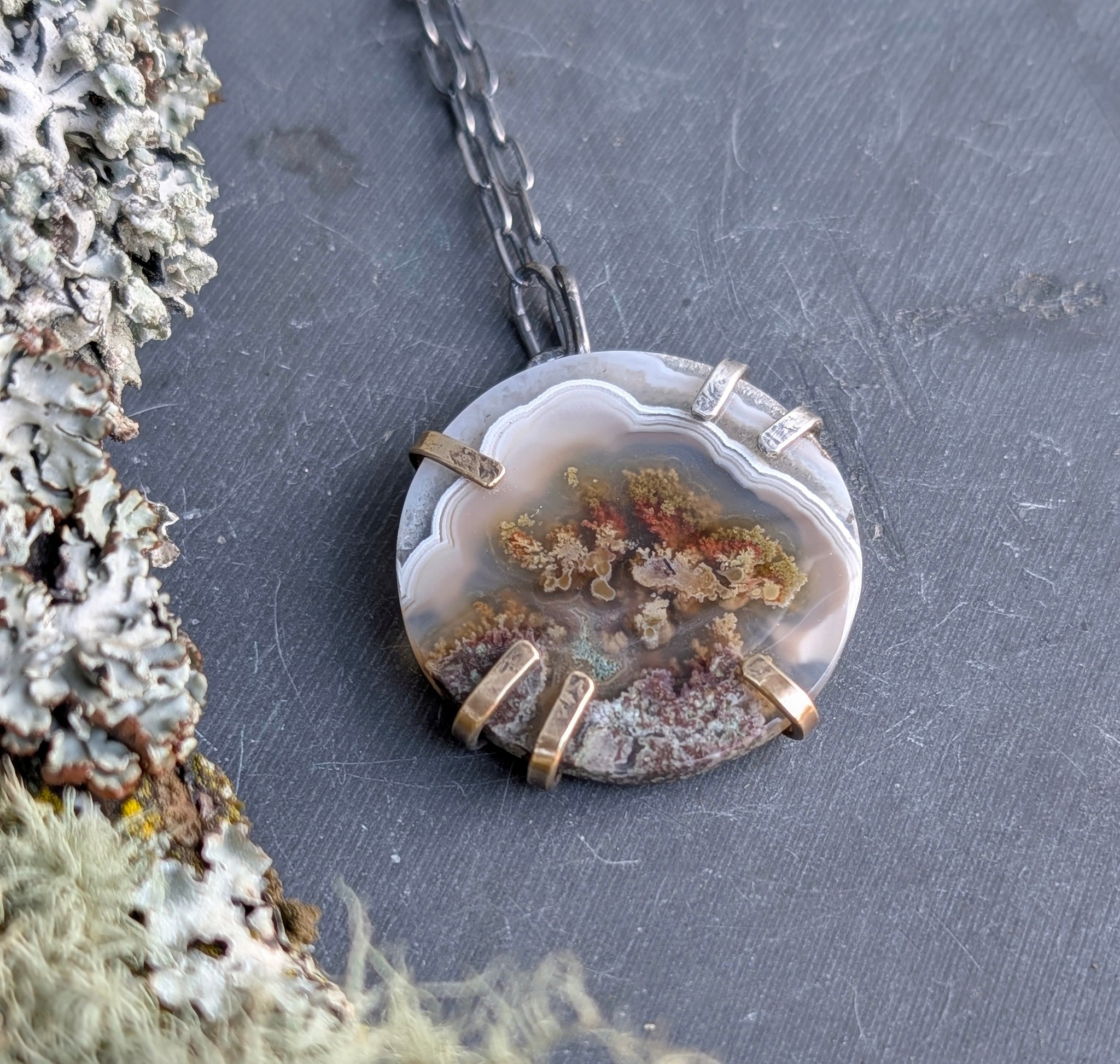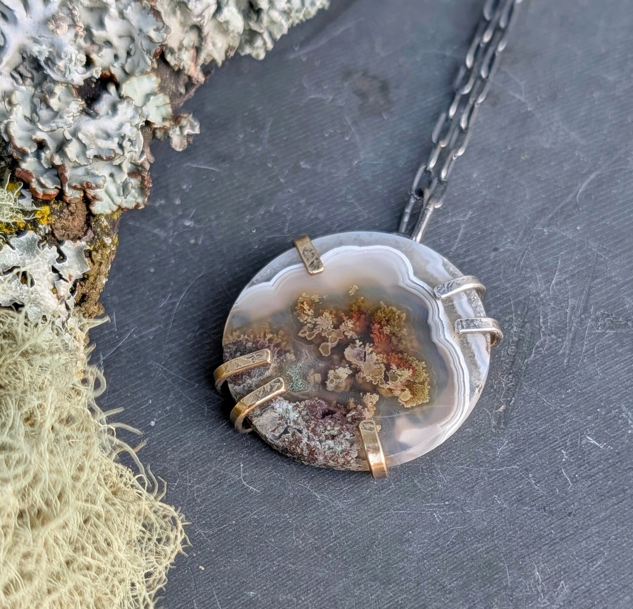 The uniquely patterned slice of moss agate has been set within an organic prong setting with playfully asymmetrical prongs cradling it in place.