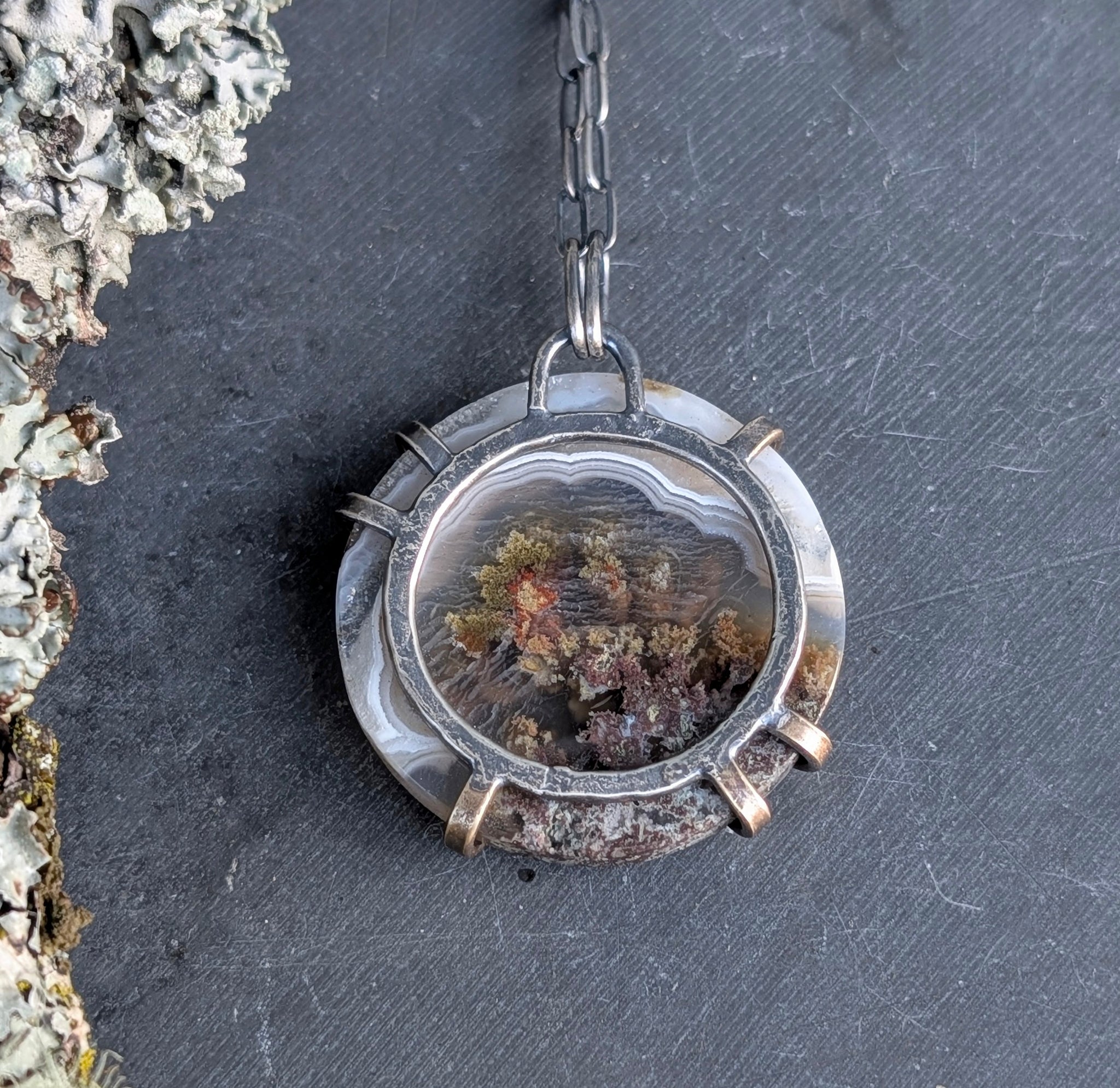 Agate, brass and sterling silver. A patina has been applied to darken the metal.