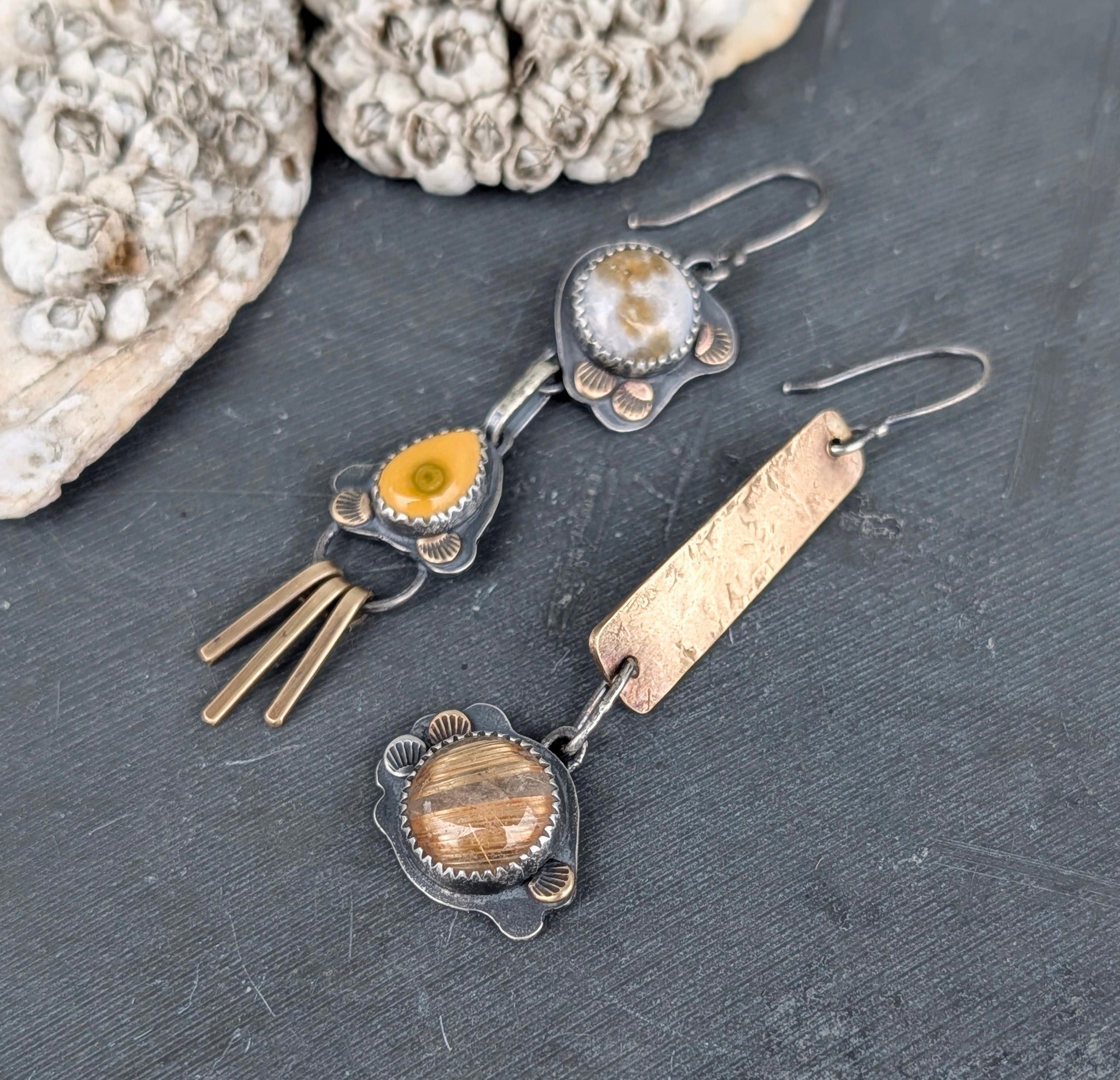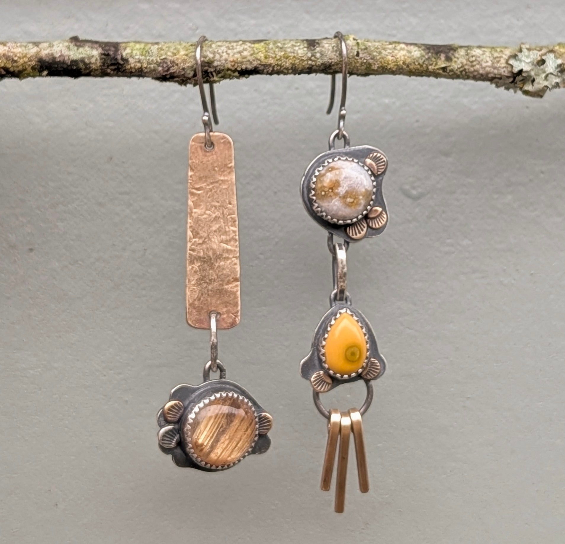 Swing into the new year with shine and a bit of fringe for fun! Two speckled ocean jasper stones and a bright golden quartz are all surrounded by organic mixed metal lace.