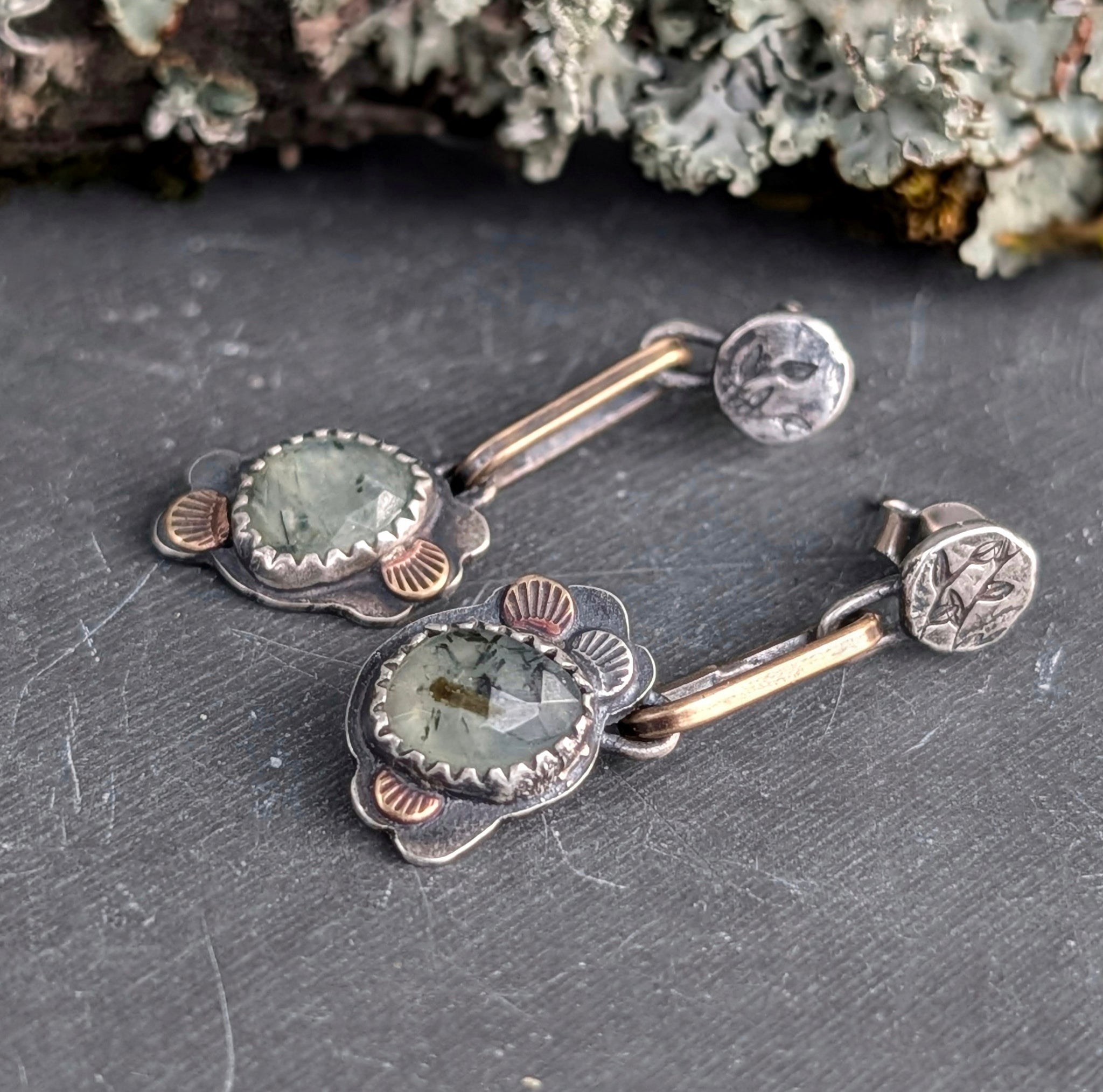 This whimsical asymmetrical pair features a duo of shimmery green rosecute prehnite stones that capture the light, all framed with mixed metal lace.