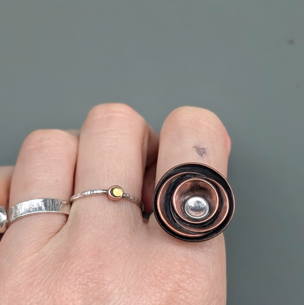 This sculptural mixed metal ring features hammered bowls stacked asymmetrically within each other to create a beautiful and fun statement piece. A fused silver band adds another layer of organic feel. A patina was applied to highlight the design.