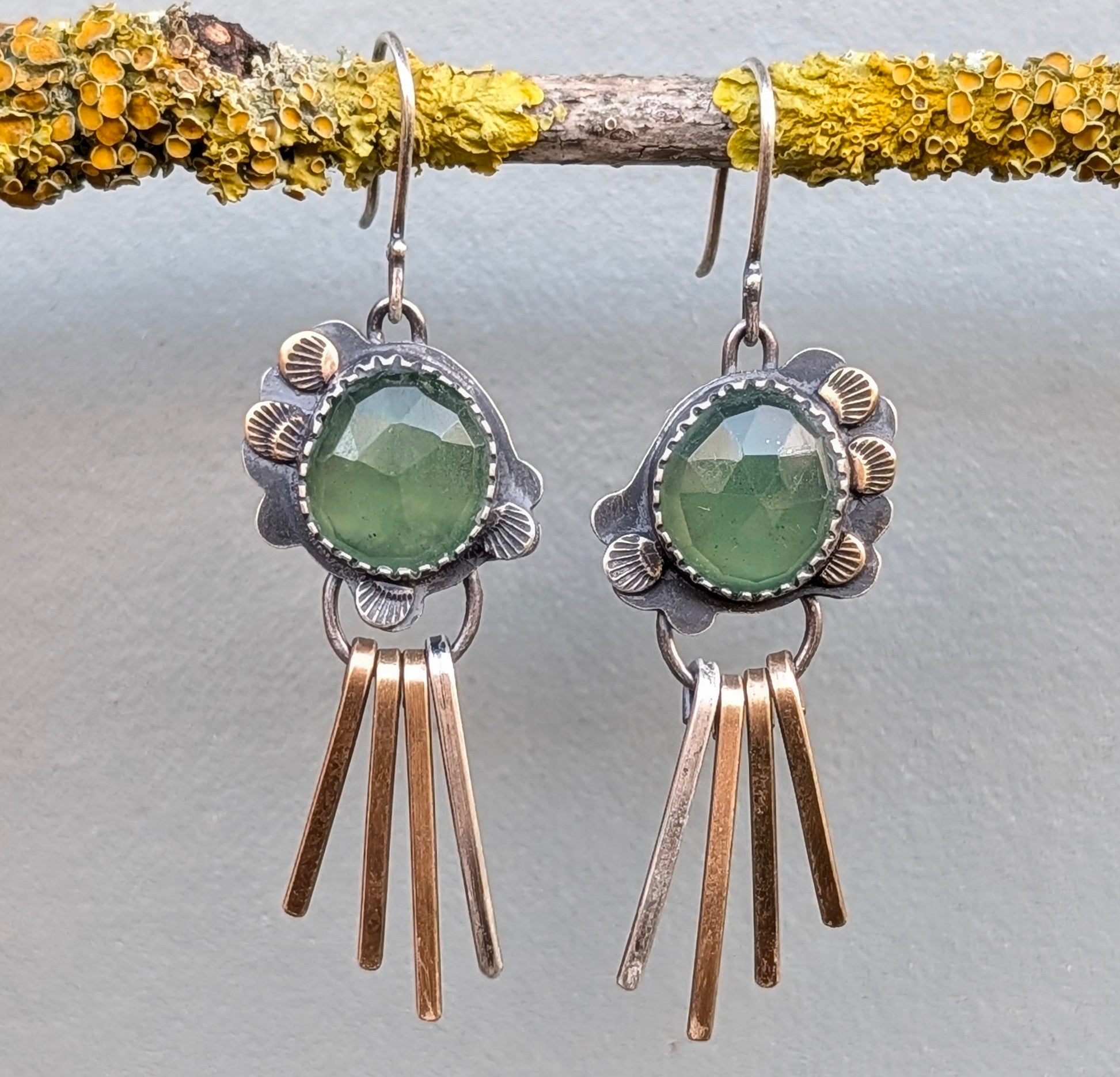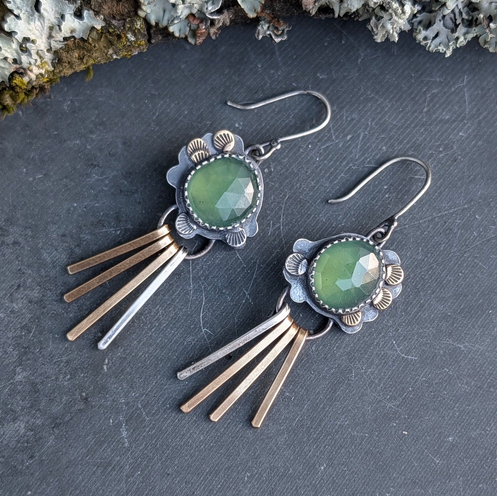 This whimsical asymmetrical pair features a duo of deep green rosecut serpentine stones that capture the light, framed with mixed metal lace. Finally, these are grounded by brass and sterling silver fringe for some fun movement!