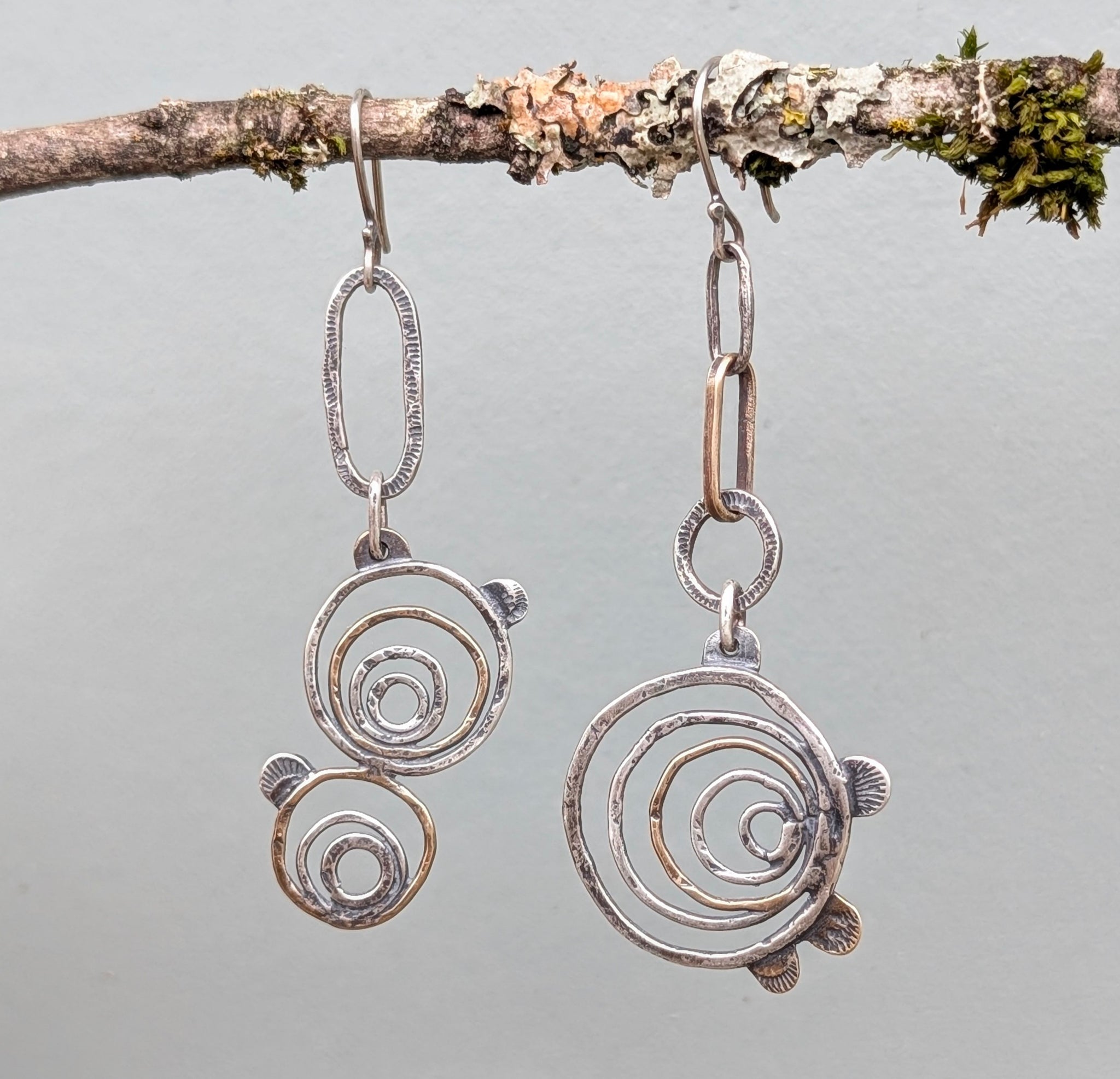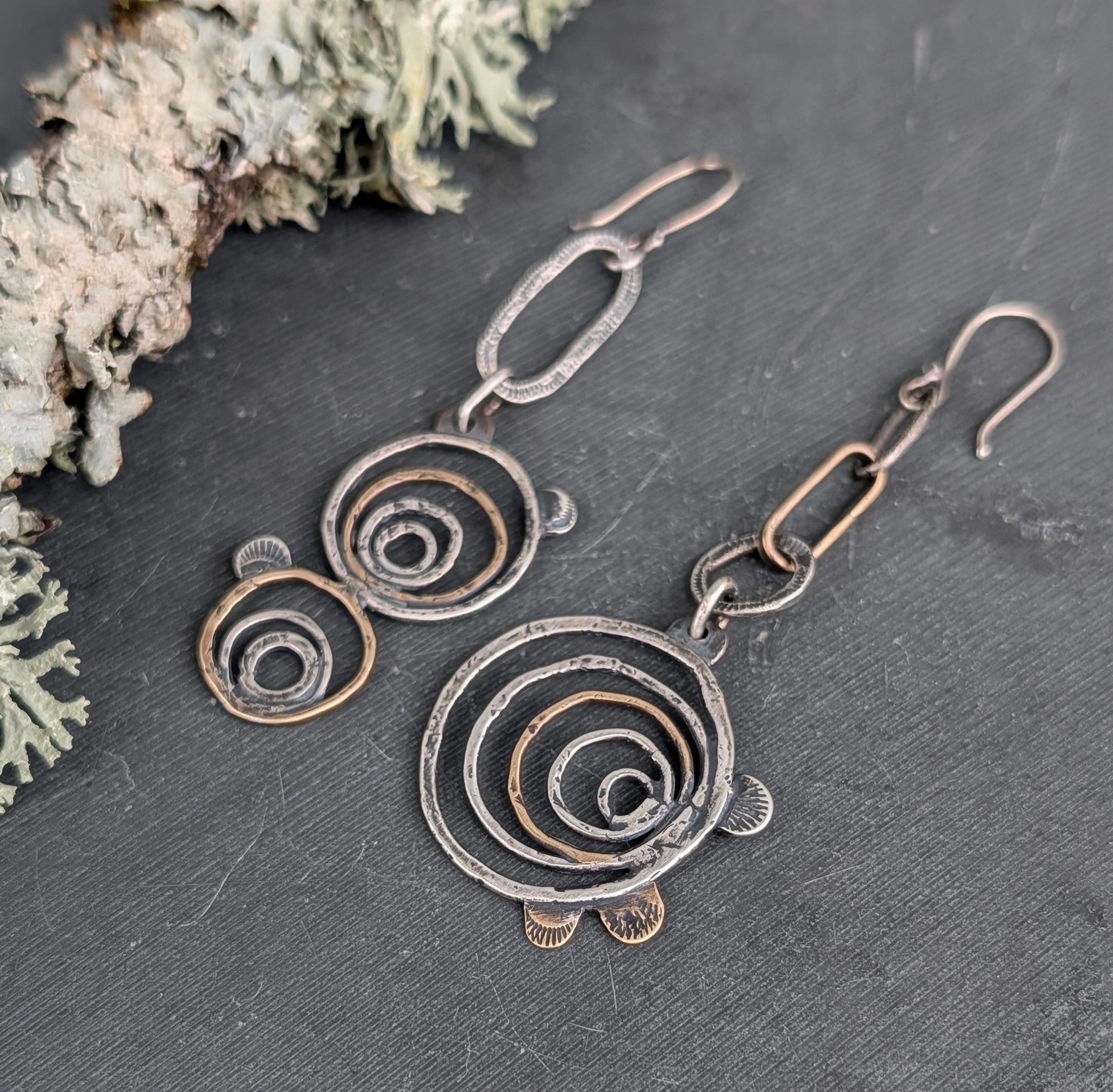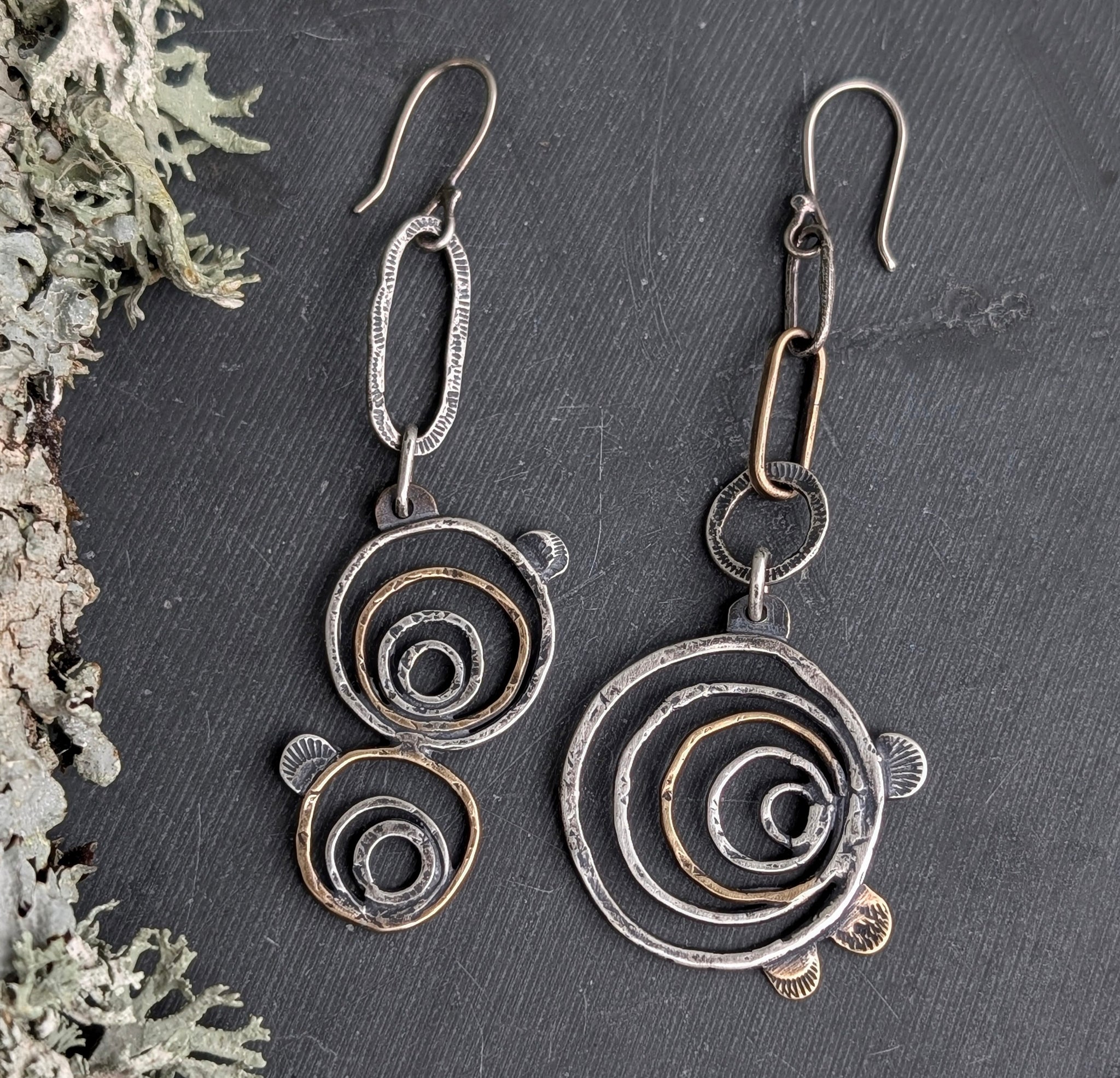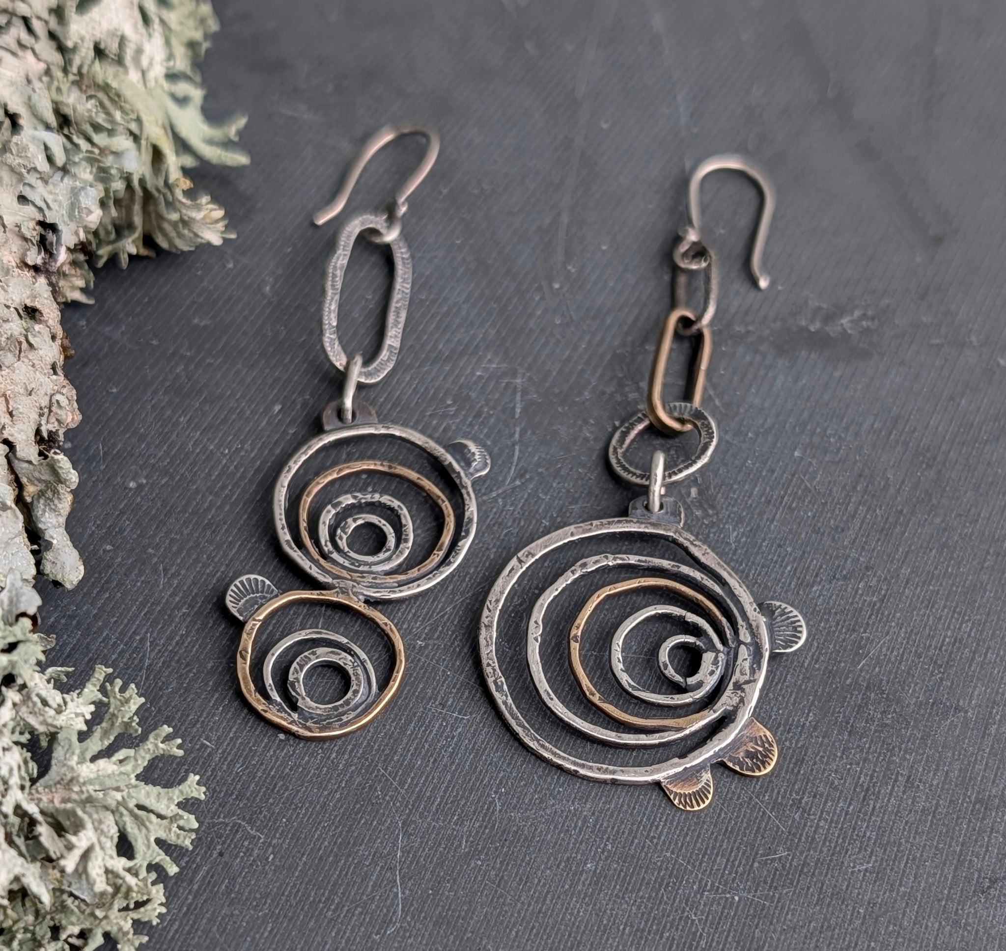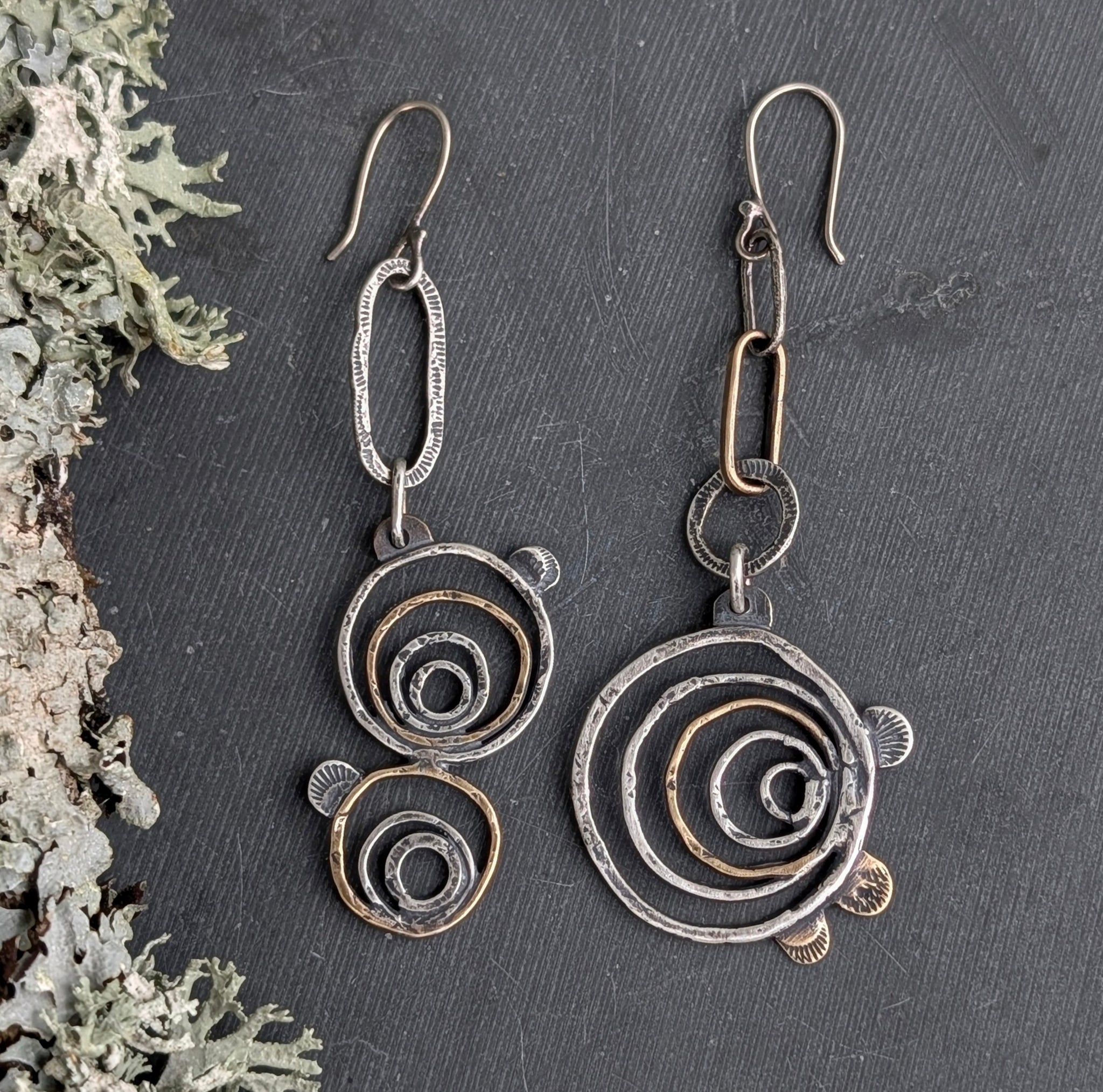 These asymetrical tree ring earrings have been handcrafted from sterling and brass. Meant to look like a cross-section of a tree with bracket mushrooms as a frame for added detail. Textured and given a patina to highlight the unique details.
