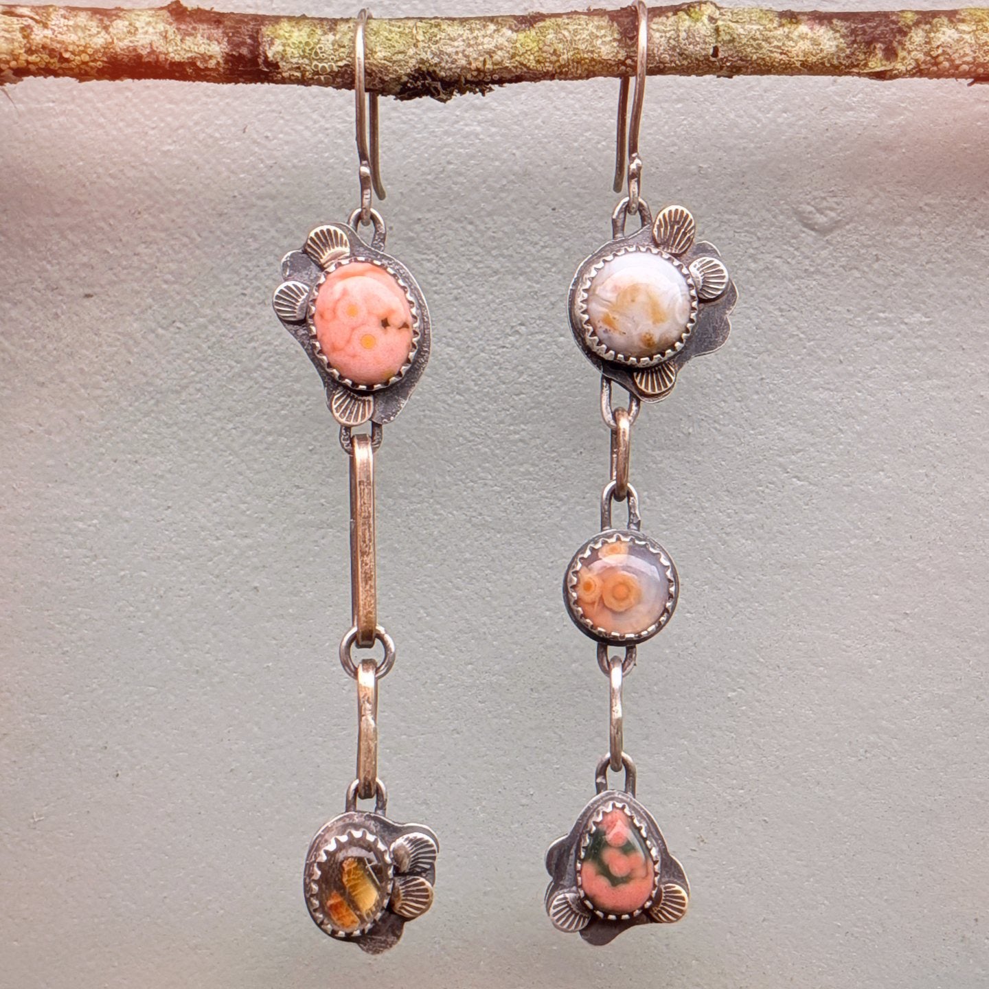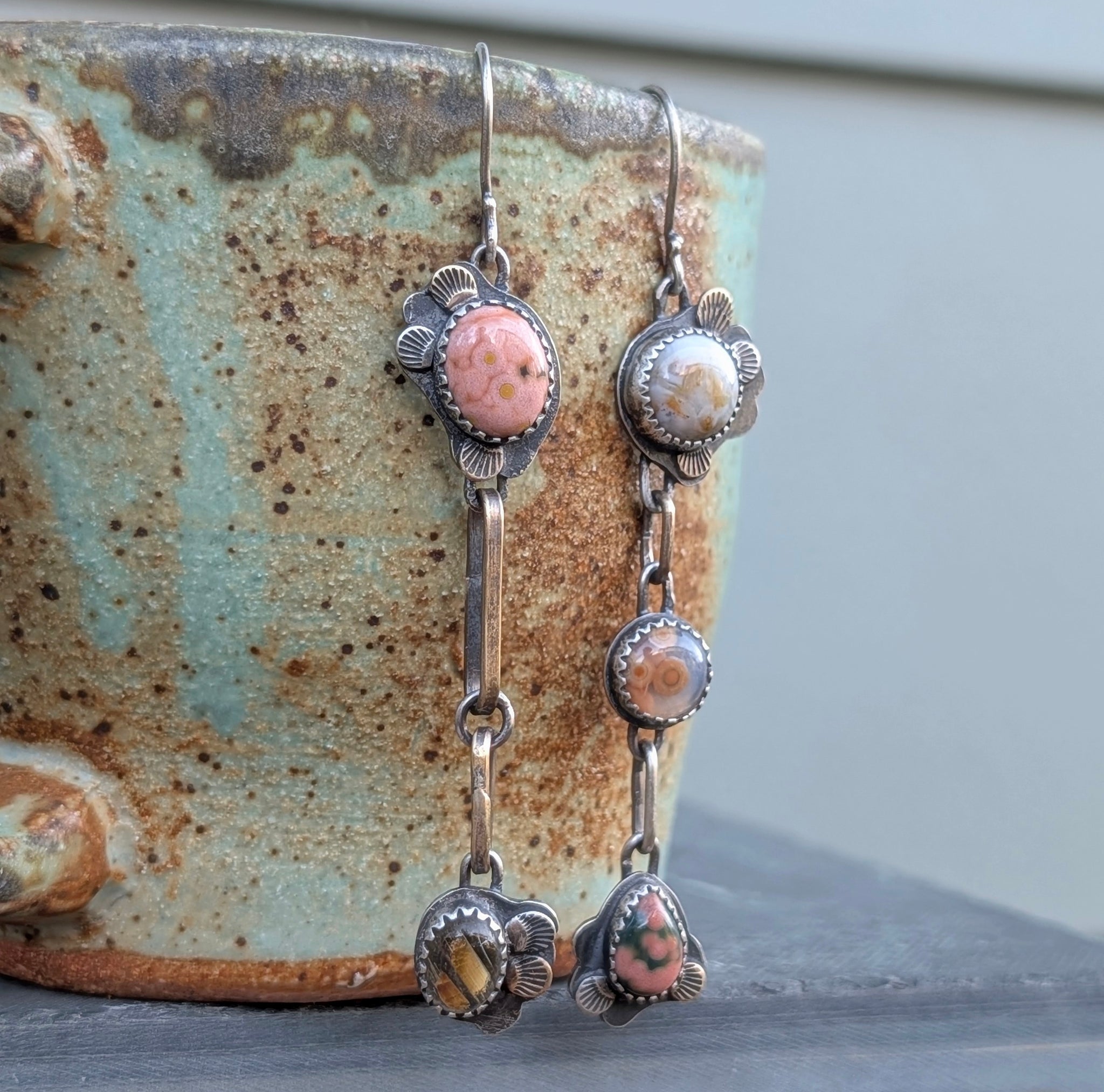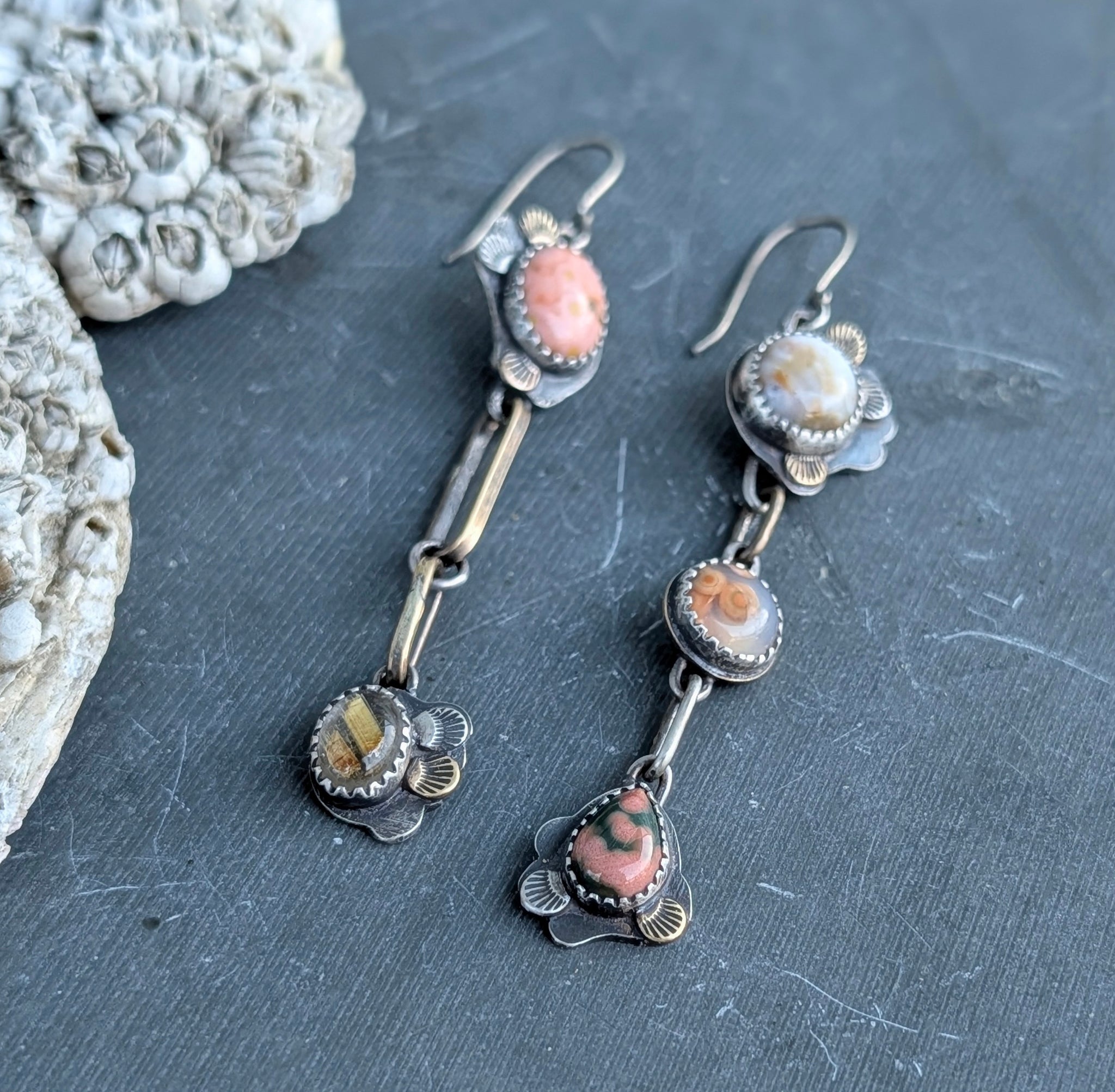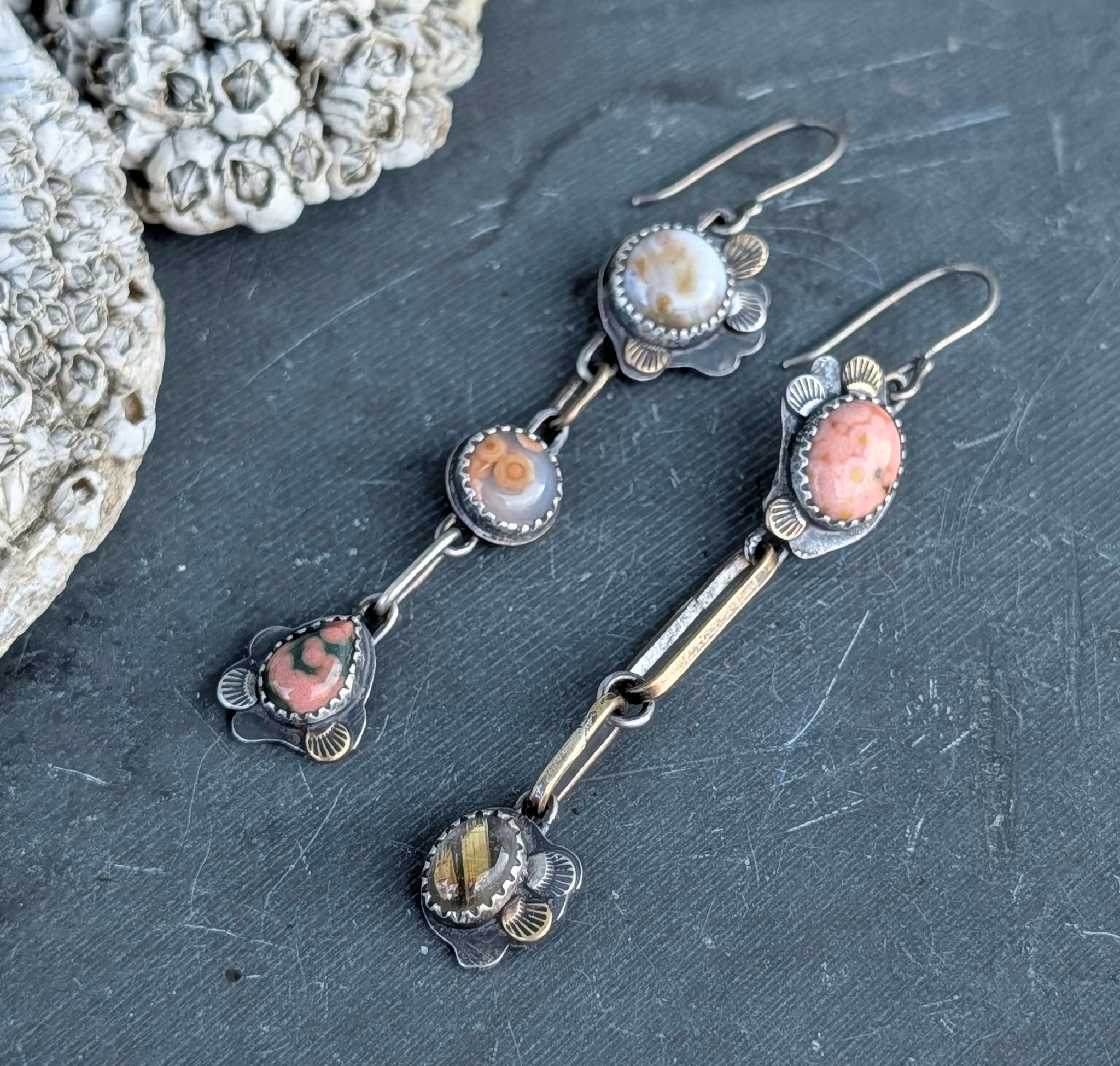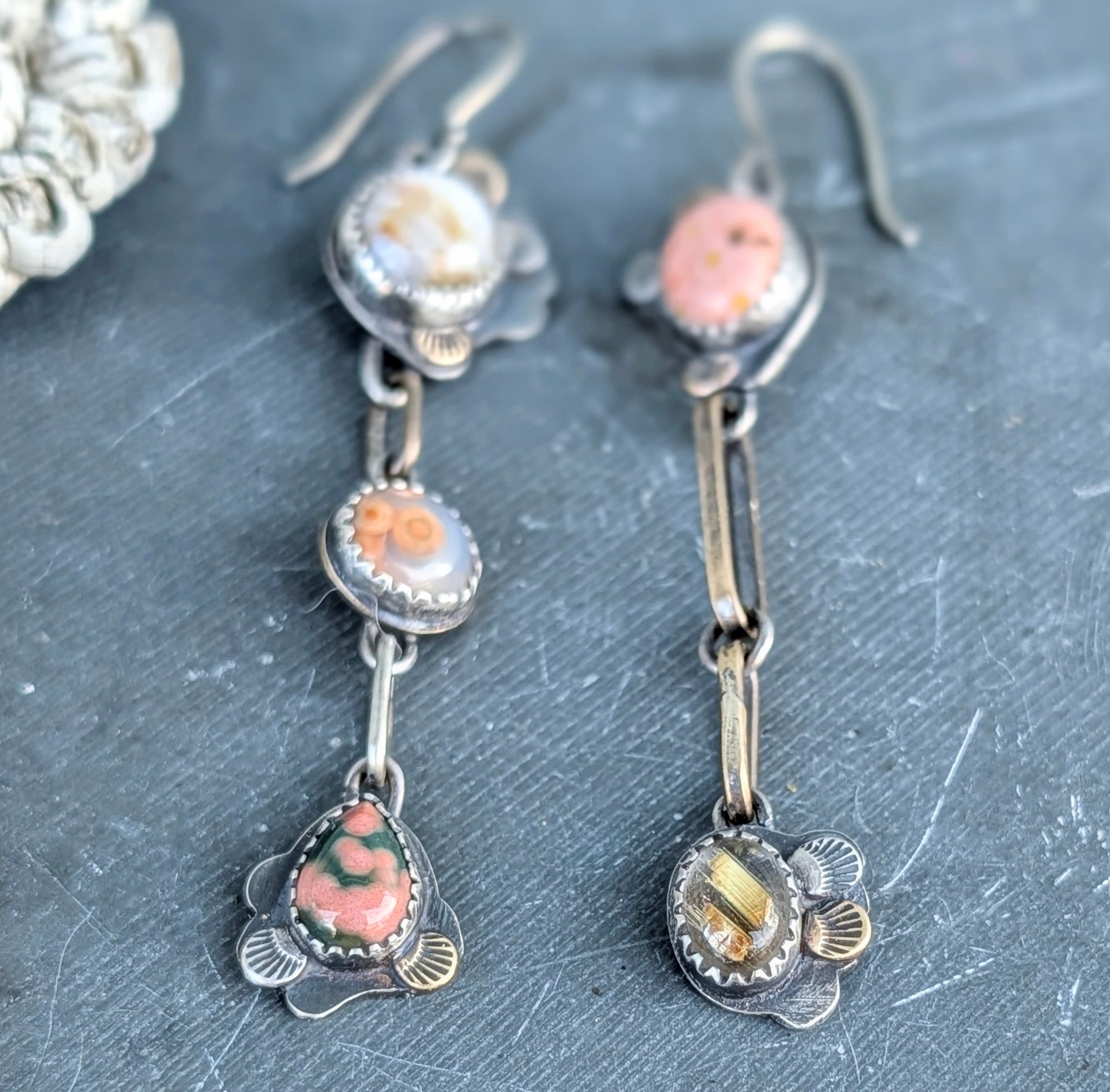 These long asymmetrical earrings feature a selection of five stunning gemstones - four uniquely patterned ocean jaspers and one sparkle-filled golden quartz for grounding - all surrounded by grounding mixed metal lace.