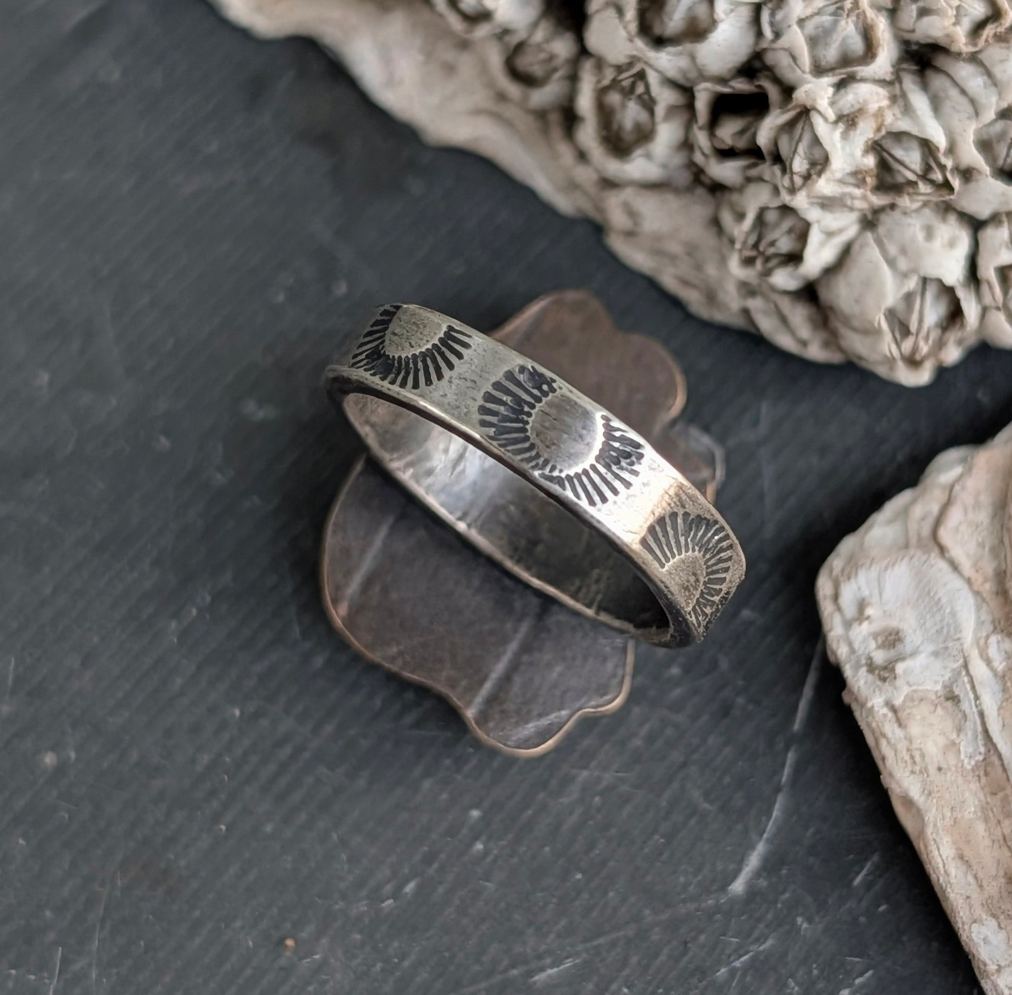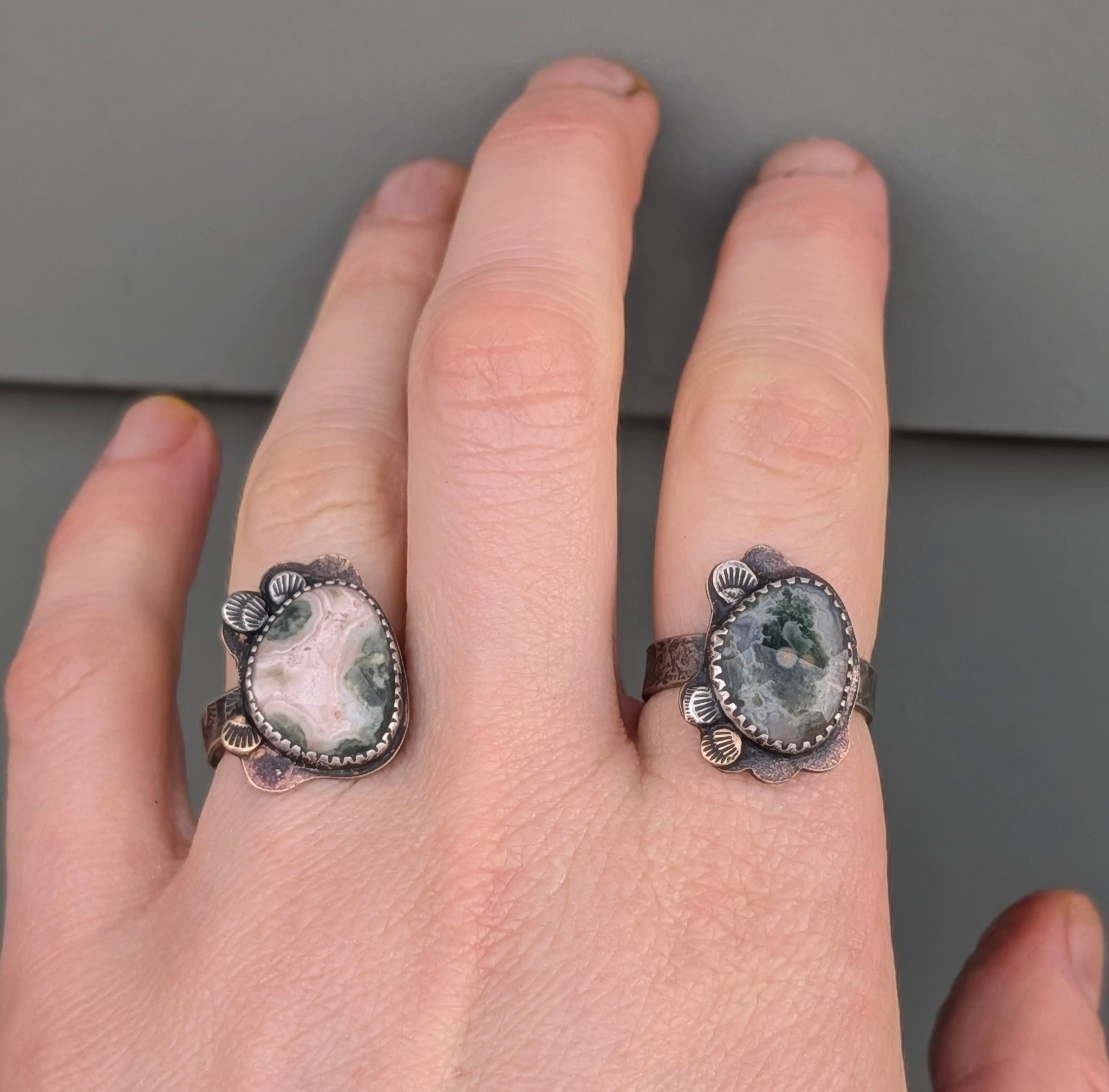 This beautifully patterned orbital jasper has been wrapped in a textured sterling serrated bezel and paired with hand-fabricated sterling silver and brass lace meant to honor the beautiful forms of bracket mushrooms, such as medicinal turkey tail. This ring features a brass backplate that adds a rustic look and feel - meant to feel like a piece of wearable nature.